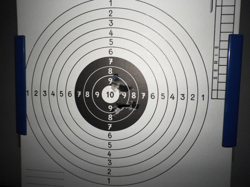 Tak jsem zas měl chvilku na hraní. Zásobníky - problém byl s plněním - dokud jsem nechytil správný grif, šlo dost plynu vedle. Osvědčilo se mi plnění na cca 10 sekund. Zásobník bohužel nevykazuje žádnou známku naplnění - nesyčí, neodfoukne si, nejde nějak poznat, že je už plný. Vážil jsem to a při plnění 5 i 10 sekund jde do zásobníku 5g plynu bez měřitelné ztráty (přírůstek hmotnosti zásobníku = úbytku hmotnosti láhve, ale přesnost váhy je 1g, takže docela velká možná chybovost). Mám 2 zásobníky - ten OK zvládne na toto naplnění perfektních 15 ran, bezproblémových 30, pak nastupují závady (slabá rána, nepřetáhne závěr). Je to ale také dáno rychlou střelbou, zásobník se ochladí.Když ho mezi naplněními zahřeju, dal by i 40. Druhý zásobník i při pomalé střelbě občas střelí "plnotučnou ránu", pak dá takový pšouk, že ani nepřetáhne závěr. Natáhnu ručně a další rána až dvě jsou pak OK a silné, pak zas nepřetáhne. Divné. Zkoušel jsem ještě znovu soustřely na 3 terče (8 ran na 6m). Zvláštní je, že čím plnější zásobník, tím víc to jde vpravo. U ostré by to mělo nějakou logiku, ale AS má hladkou hlaveň, takže tohle mi hlava nebere