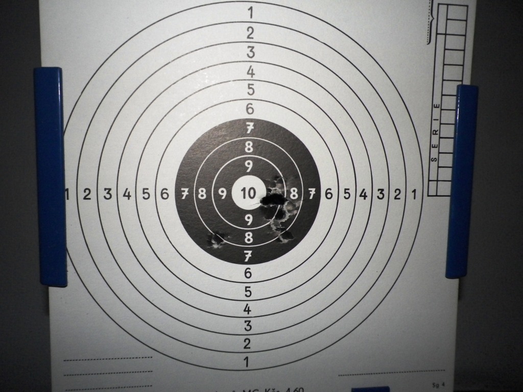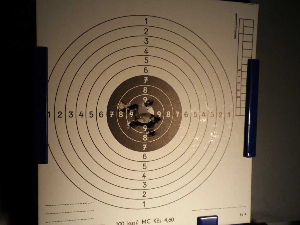 Severan - klobouk dolů před Tvou ochotou pomoct a taky před kvalitou fotek... Psal jsi, jestli můžu hodit terč. Fláknul jsem narychlo 2x6 ran na vzduchovkový terč na 6 metrů. Ten horní a severozápadní úlet do 6 a 7 bylo prvních 6 ran po naplnění zásobníku. Mám zatím dojem, že je lepší ho plnit v kratších dávkách, aby bez problému vystřílel těch 30 ran místo 45 - první rány s čerstvým zásobníkem mají citelně větší blowback a lítají nepřesněji. Navíc ještě nebylo šáhnuto na hop-up, takže bych ten terč nebral jako definitivní vizitku zbraně  Průměr devítky je 2,4 cm.