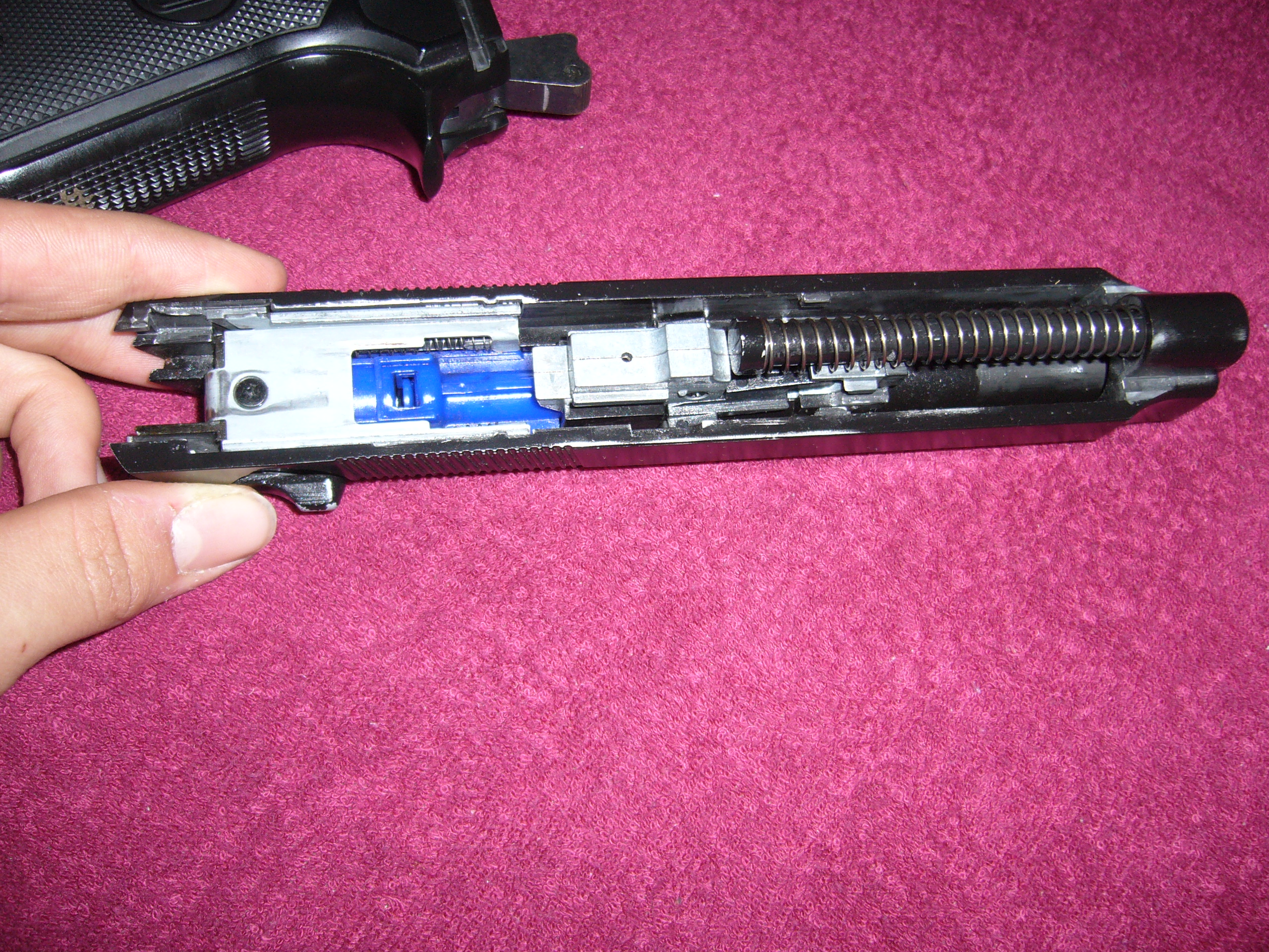 jop hi capa a m1911 to maj stejny.. ale beretta to ma reseny uplne jinak, není to jak u klasicke že udelas zakladni rozborku a v takove kostce by měla byt dirka na imbus jak to ma KJW. ALE : WE ji nemá, má to nekde u hlavně, takze musíš ji rozebrat jeste více. Na tomto video kolem 1 minuty bude provádět rozborku, a kdyz se podíváte, tak jasně uvidíte že žádná dírka pro hop tam není. http://www.youtube.com/watch?feature=pl ... uSUxYslOCMKJW beretty to maji takto: