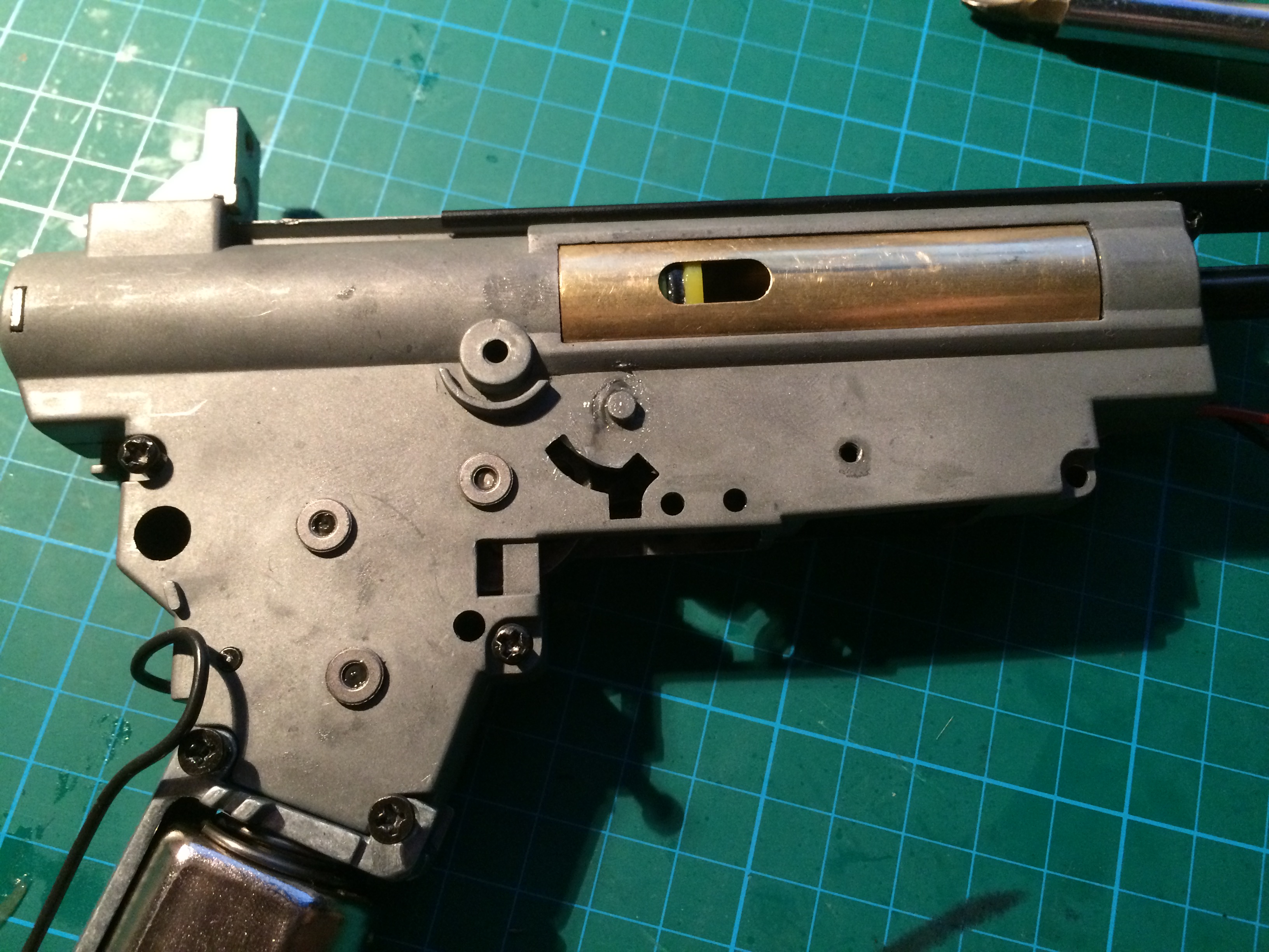 Po X letech jsem vytáhl starou CA36C a chtěl jsem ji znovu rozchodit. Koupil jsem novou pružinu, hopup gumičky, baterku(9,6V) a očekával jsem, že po výměně bude vše šlapat jako hodinky, leč opak byl pravdou. Po výměně pružiny základní (cca M100 prý) na M130 mi motorek ani nehnul s pístem. Udělalo to takový zvuk jako bude v následujícím videu a konec (zvuk je způsoben snahou motorku otočit se s tím, že se neotočí pastorek ale tělo motoru). Pořídil jsem tedy pružinu M120 - pokrok, kvér vystřelil, tak jsem se těšil že to je v cajku, jenže po pár výstřelech se zasekl v cca 95% natažení a poslední 3 zoubky dělal to samé jako při M130 - viz video: https://youtu.be/qiqurCs8YSA Na fotkách přikládám stav, v jakém se kvér vždy zasekl.
