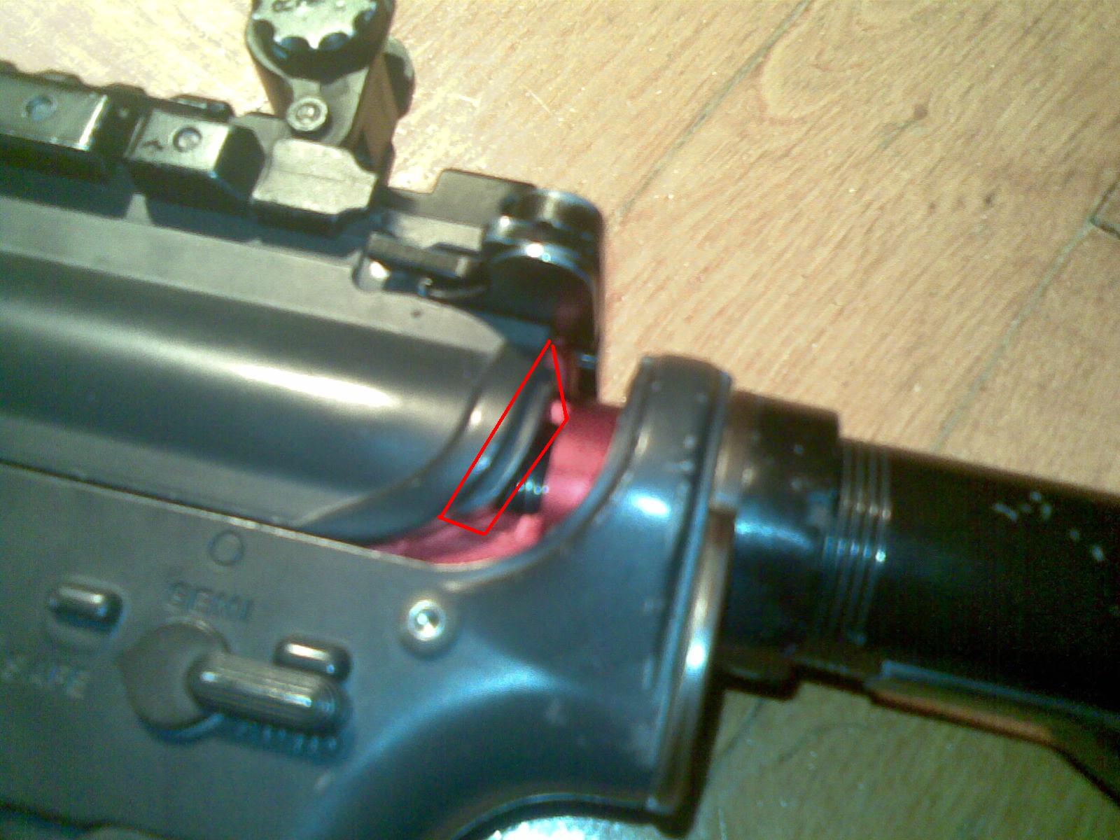 Jedná se o tělo M4 značky GP. Před třemi lety, při noční akci, došlo ke srážce mezi mnou a kolegou. Došlo k prasknutí v oblasti předního čepu, horního těla. Následně jsem nechal navařit materiál a díru opět vyvrtat. Ovšem díra byla vyvrtána trochu křivě. Následkem toho došlo k vychýlení komory a trysky, kde se o sebe oba díly třely, zpravidla plastová tryska (Systema). Takto jsem byl odkázán používat pouze jednu vzduchotechniku, se kterou nebyl problém. Průser ovšem přišel nyní, kdy mi praskla hlava pístu a já musím měnit vzduchotechniku, tím pádem i tělo zbraně, neboť by docházelo k dalšímu obrušování materiálu a zbraň by měla malý výkon.