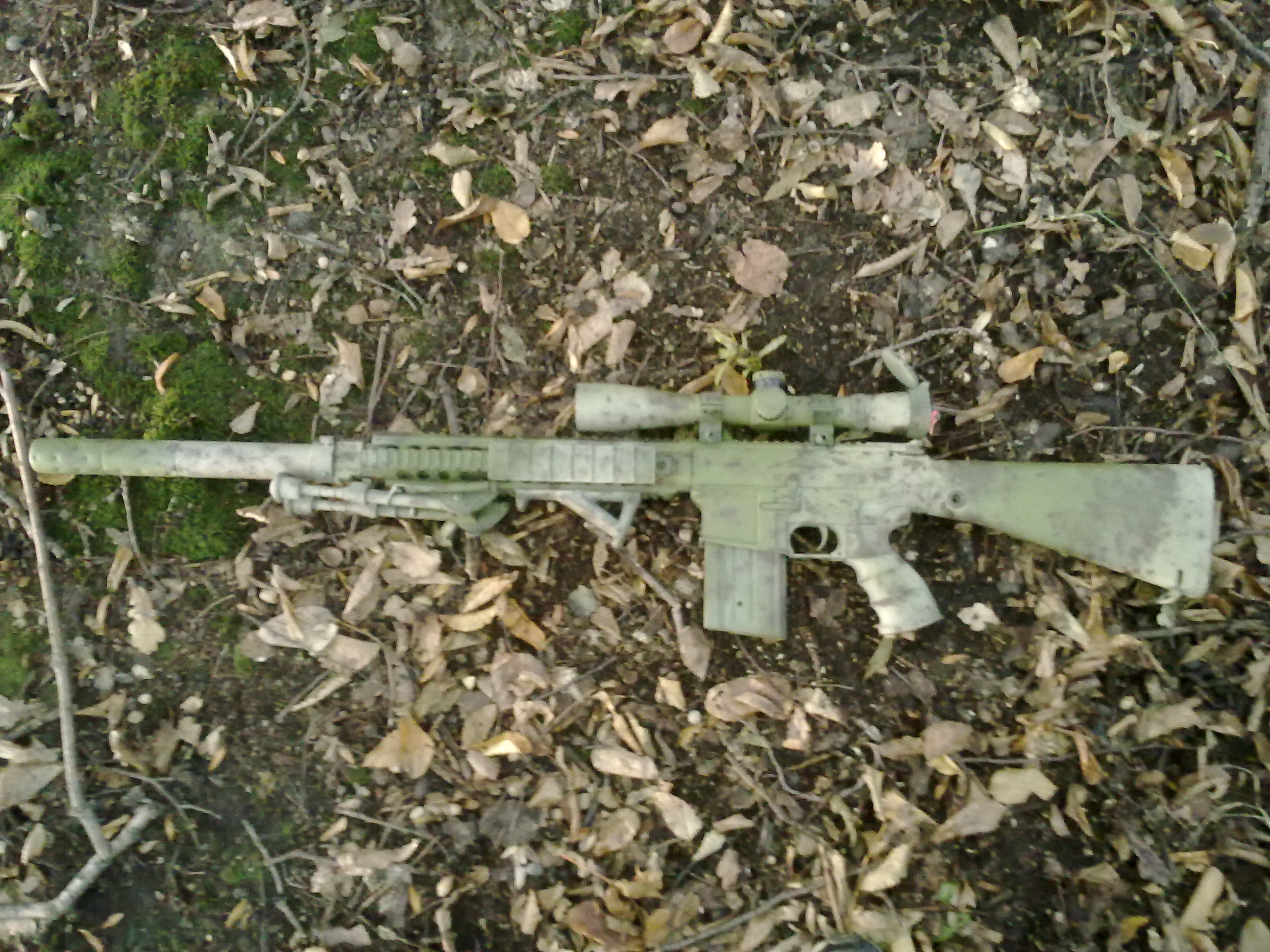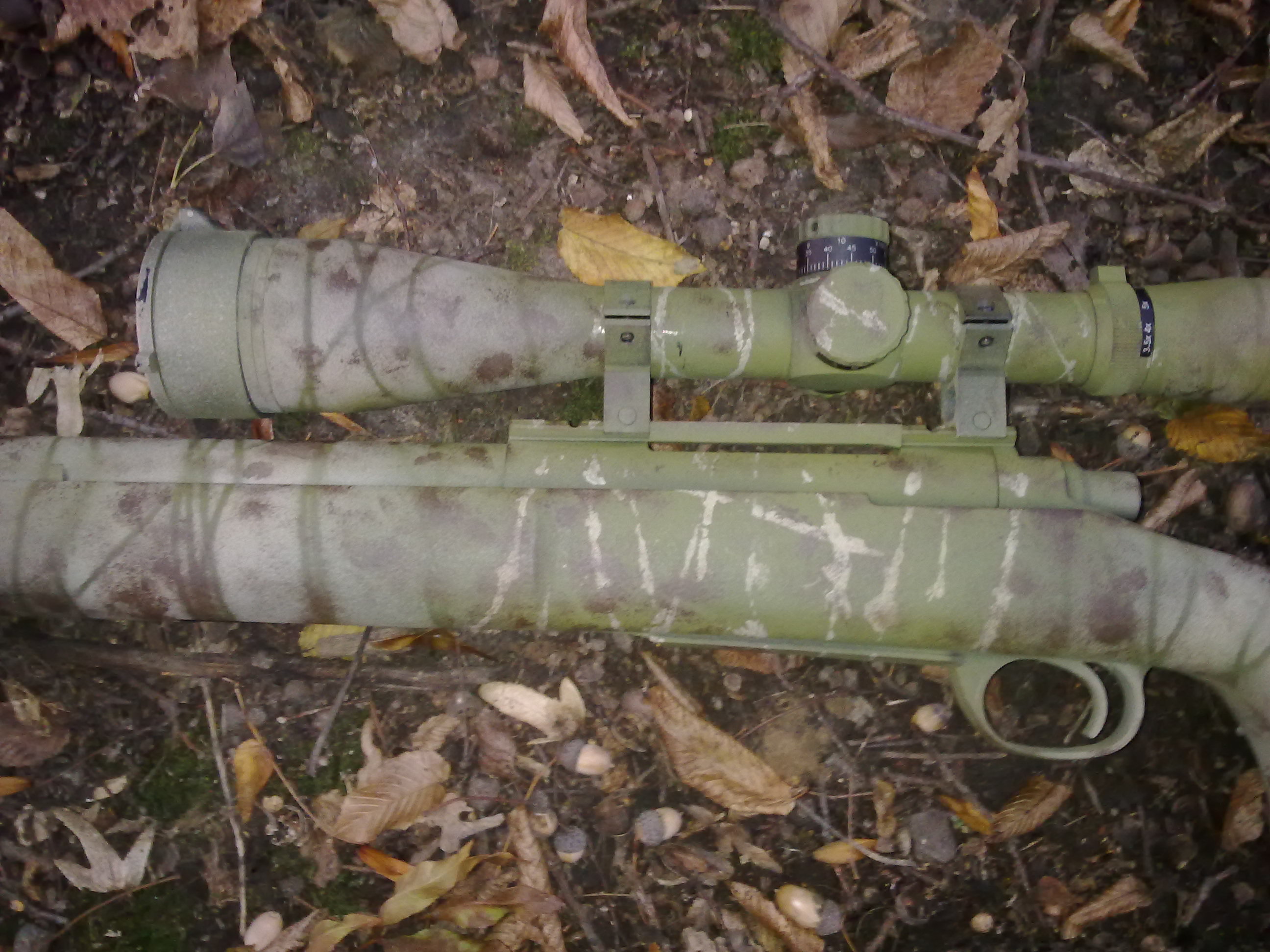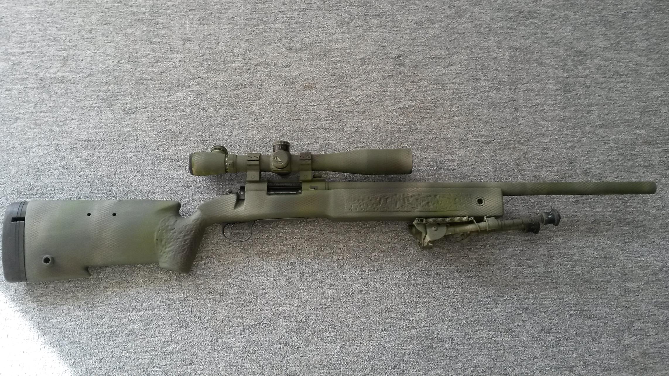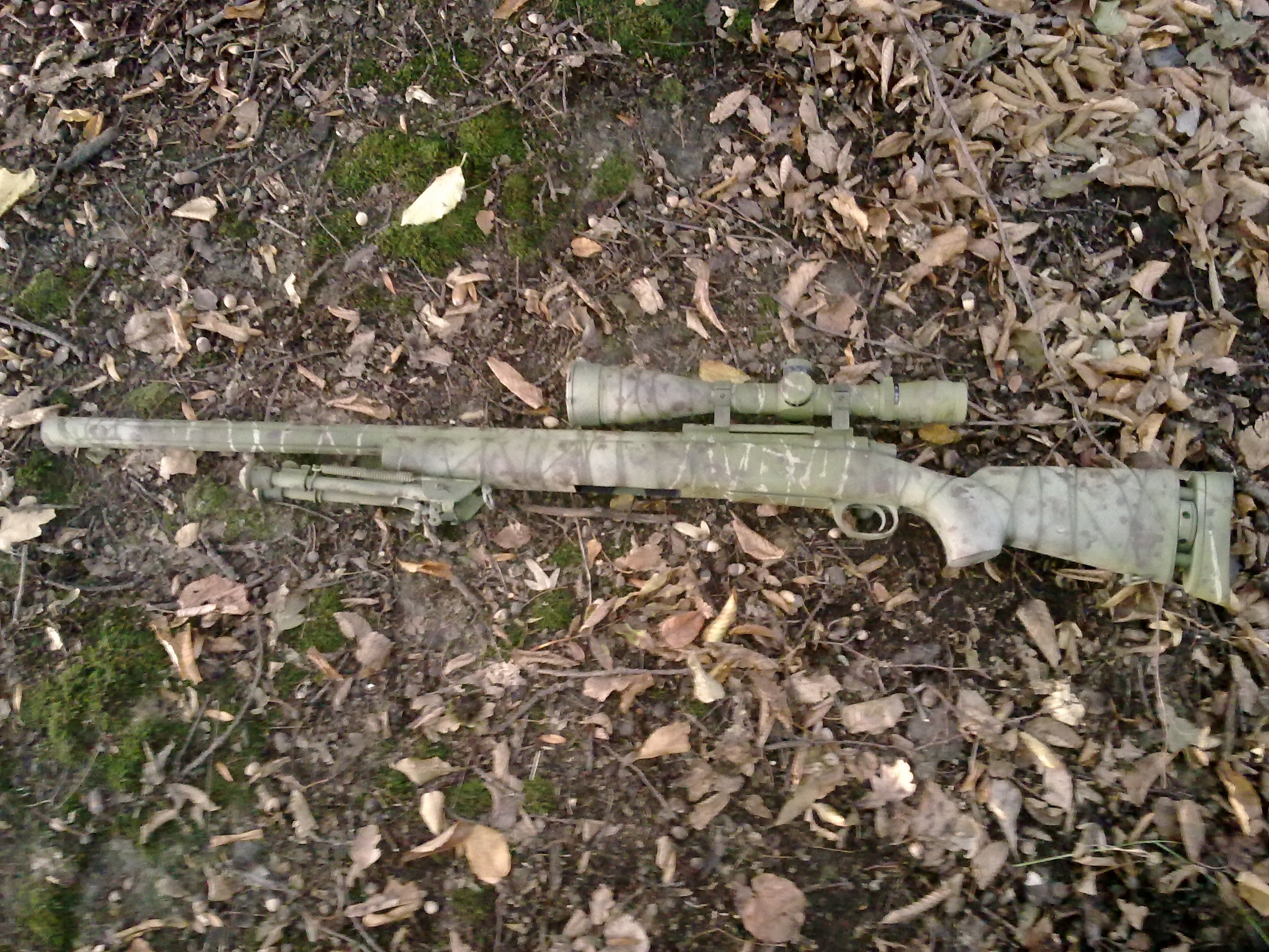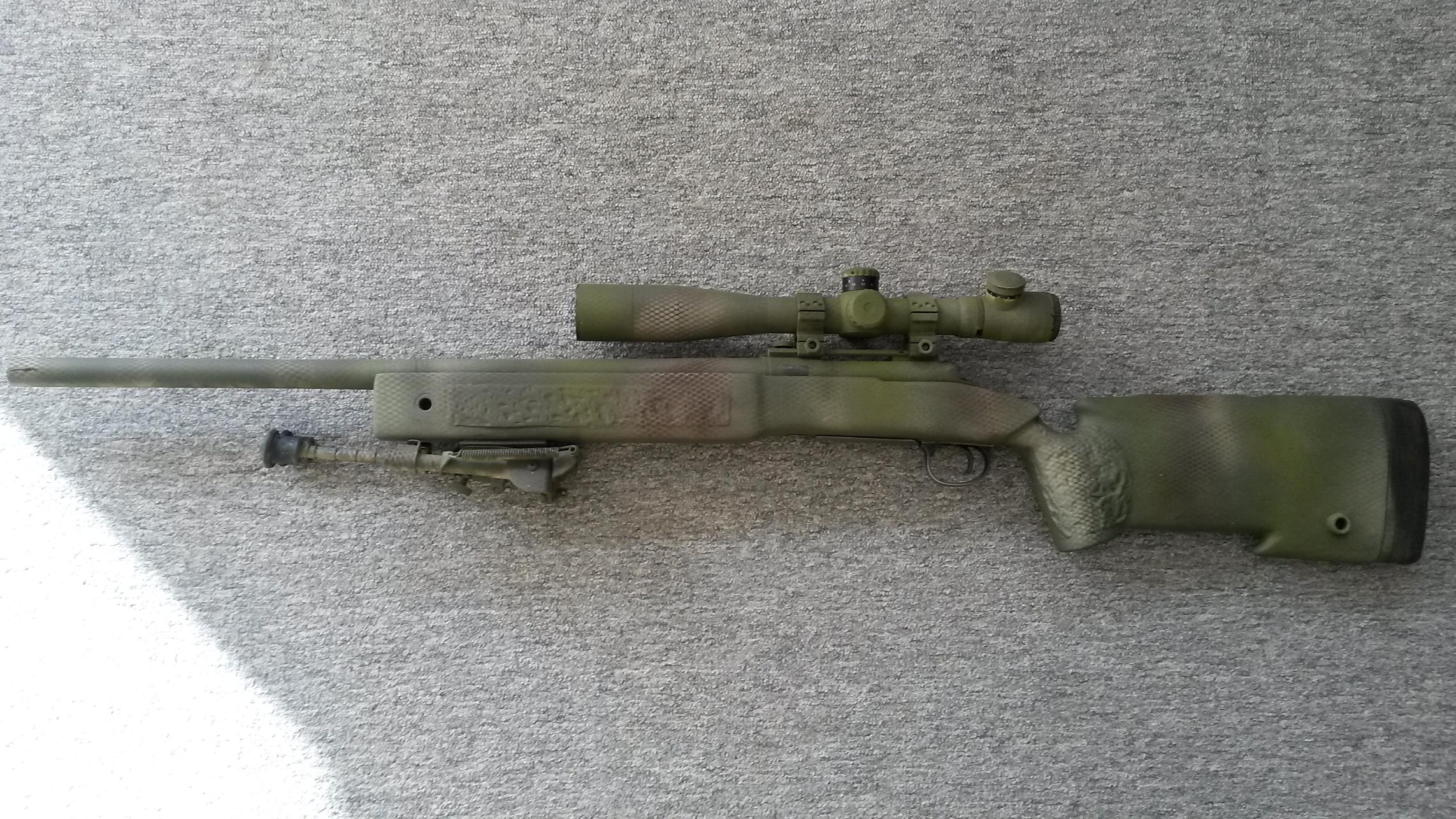 Zdravím Jen přihodím fotky prvního nástřiku zbraně. Je to stříkané obyčejnýma barvama ve spreji a přelepené maskovací kobercovkou. První pokus o přestříkaní zbraně a přidávám i fotku jak vypadala před. Fotky zde http://websygnity.rajce.idnes.cz/L96Pište co se Vám líbí/nelíbí ať vím co udělat lépe. Díky.
