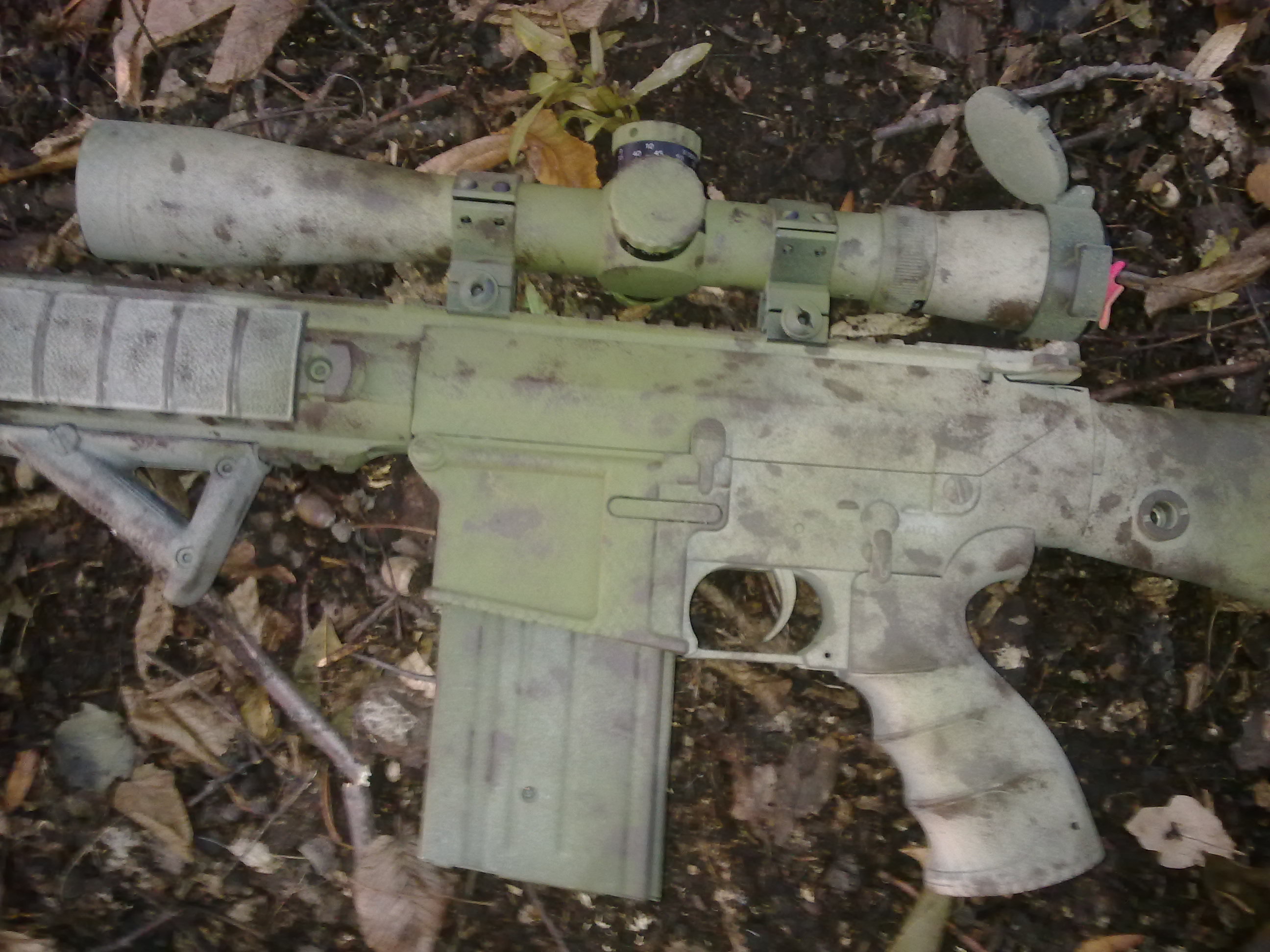 Jj to jsem dělal já, je to olive základ a na tom brown a občas black. Možná i trochu light green a khaki (jde to vidět zespoda na zásobníkový šachtě), ale vyzkoušej si to, zkrátka aby se to rozbilo  ) není to nic složitého. Napsali jsme o tom i článek http://www.invisiblegear.cz/maskovani-zbrani/