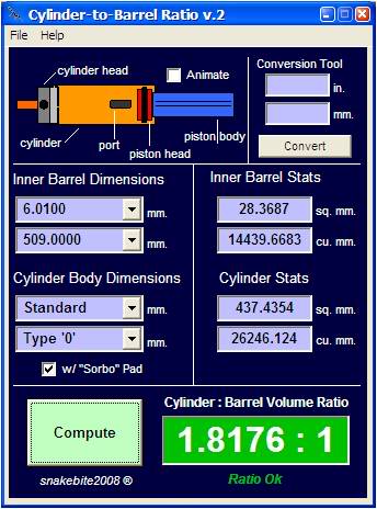 Pro případ 2:1: Výška válce = (2*průměr hlavně na druhou*délka hlavně)/(průměr válce na druhou) Aha tak tady to je. Hoši už jste z praxe nějak vykoumali ten poměr? Aby tedy co nejpřesněji narazila hlava na hlavu v okamžiku co kule opustí hlaveň? Zatím se vám to pohybuje od 1,8:1 do 2:1. Jak pokročila praxe? Kód: Spočítáš si objem hlavně (r=3mm) s tim, násobíš koeficientem říká se 1,5 až 2 (čim máš těsnější vzduchotechniku, tim spíš volíš 1,5, pokud nemáš protitlakou hlavu pístu tak taky bereš větší). Potom vezmeš vypočtenej objem hlavně a vypočítáš z něj výšku (r= tušim 12mm). K vypočtený výšce přičteš výšku, kterou ti zabere hlava válce (+6mm). Tim získáš místo předního konce díry (druhej konec díry bude dál).