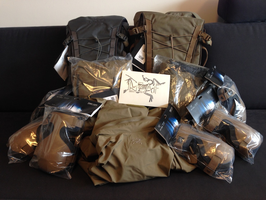 Kolem se válí 6x Arc'teryx knee pads. Dole uprostřed leží Arc'teryx Alpha Leaf v krokodýlu (ta patří mé maličkosti). Uprostřed, ještě zabalené, leží Arc'teryx Alpha Leaf LT a Arc'teryx Atom (oboje v krokodýlu). A úplně vzadu leží opřený 2x Arc'teryx Khard.