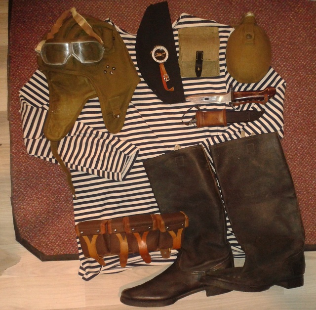 VMF triko s dlouhym rukavem Výsadkářská kukla 80-tá léta Brýle (pouze jako ozdoba, na airsoft naprosto nevhodné) Náramková adrianova buzola VMF lodička Sumka na 2 granáty Polní láhev Bajonet na AKM 2 sumky na Mosin-Nagant z padesátých let. Sapogi