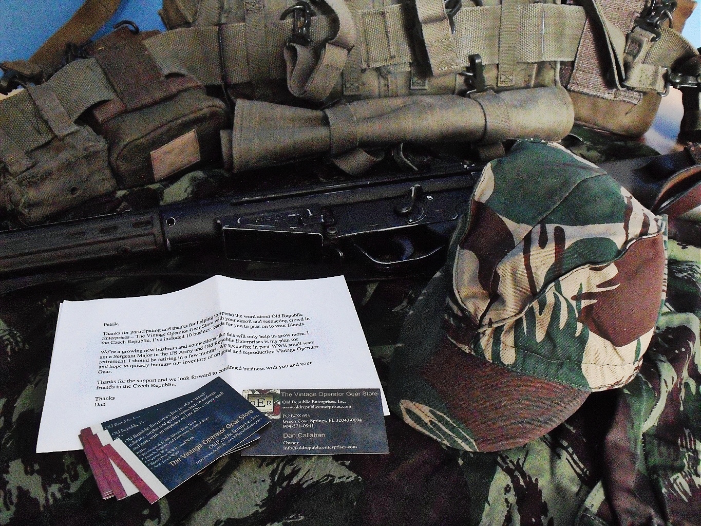 další binčus hozenej do zátiší ať to trochu vypadá. Nejedná se ani tak o nákup, jako o výhru v jedné internetové soutěži. Včera dorazil malej balíček z USA a já celej natřepanej čekal, co z něj teda vypadne. Už vás nebudu napínat, takže v balíčku jsem našel bezva repliku tzv. Kiko cap v oboustranné verzi. Na jedné straně se nachází portugalský maskáč a na druhé rhodézský, takže varianta, kterou nosili třeba Selous Scout při operacích v Mozanbique. Součástí byl samozřejmě taky děkovný dopis a sada vizitek od OER. Jinak v zátiší je taky vidět portugalská košile, G3 od CA s částečně dodělanou ražbou, SADF p70 webbing. Tímhle bych chtěl taky poděkovat obchodu http://www.oldrepublicenterprises.com za možnost zúčastnit se soutěže. Koho by tenhle "binčus" zajímal, tak mě klidně kontaktujte a můžem o tom pokecat