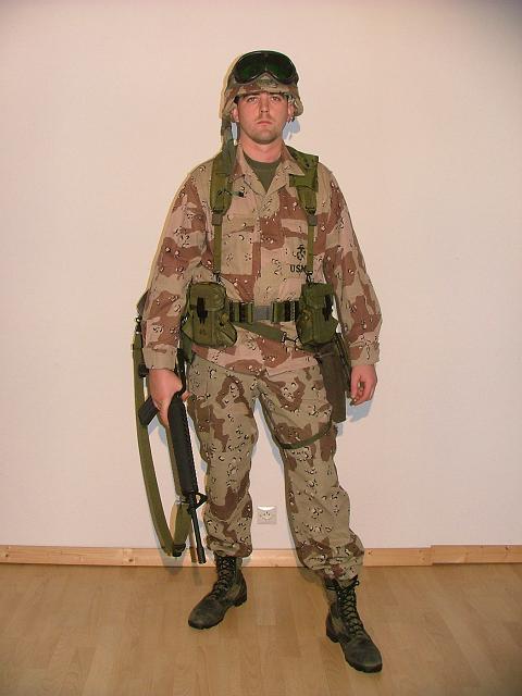 Rok 95, pěchota: Woodlandy v klasickym střihu (žádný RAID nebo podobný prasárny), černý combat kanady, PASGT helma s potahem + PASGT vesta, LBV (můžou bejt i Ypsilon treky) s LC2 nebo LC3 páskem, náprdelákem (oliv nebo wdl), dvěma čutorama v ALICE obalech, minimálně dvěma klasickejma ALICE sumkama a případně nějakym psaníčkem (kompasová sumka), M40 pouzdro na plynmasku, ALICE bágl (M nebo L). Zbraň M16A2 (nebo M249 MkI/MkII, ale k tomu je trochu jiná výstroj). To je tak nějak základ, samozřejmě pak je k tomu tuna dalších blbostí.