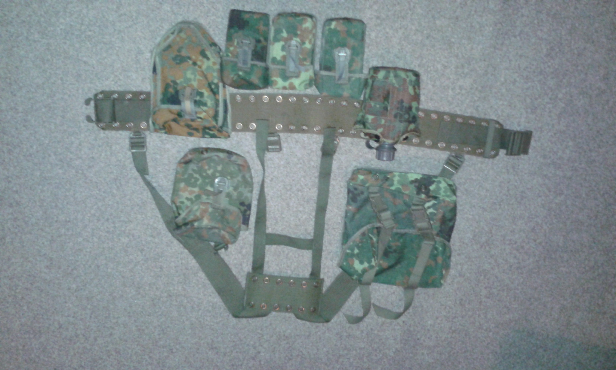 Originál nosný systém BW flecktarn v perfektním, čistém a nepotrhaném stavu. Součástí je: 1x pás, 1x kšandy, 1x malá polní, 1x pouzdro na lopatku (vejdou se dobře dva zásobníky do AK), 1x větší sumka, 3x sumka na zásobníky do G3 (vejde se i Coltový, Falový, M14....), 1x polní láhev v obalu (ta jediná je neorigo). Vše je dobře vidět na obrázku. Cena 700,- Kč. V případě zájmu se dohodneme. Prodej jen kompletu bez výměny. Možnost osobního odběru v Plzni