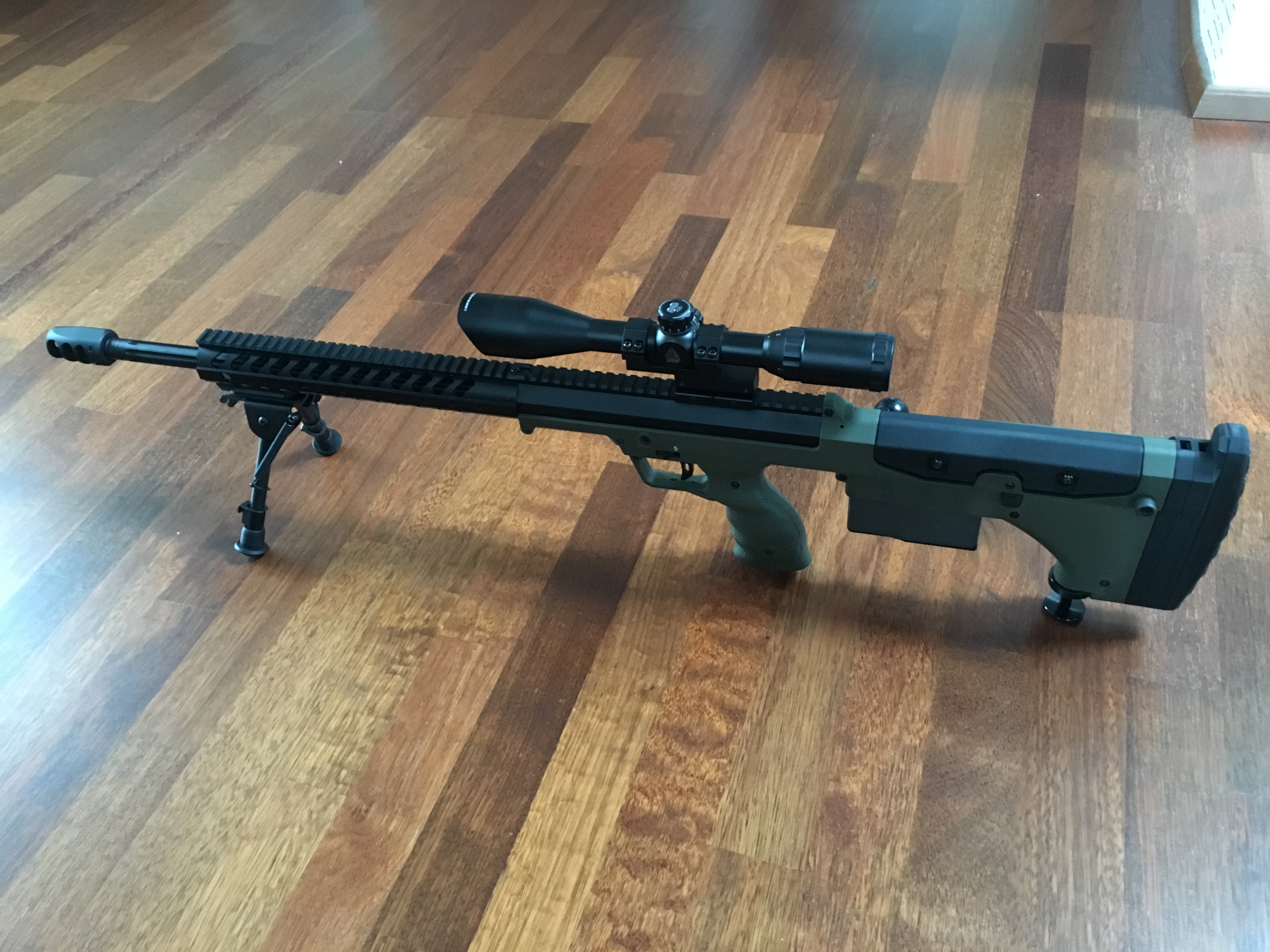 Cena za kterou jsem to vše koupil - 30 200 (zbraň - 13500, optika 3000, hlaveň 2000, dvojnožka 1200, zásobník 700, pružina 600, montáž optiky 500, hop up gumičky 300+200, doprava 4000, clo a DPH 4200).