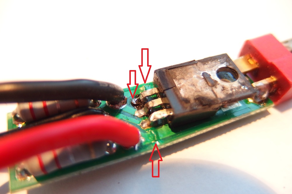 prvni ceho jsem si vsilnul je poskozeni buzirky ve spodni casti aktivni brzdy, nachazi se tam vykonove casti zarizeni, ktere by mohli zpusobit zkrat skrz kovove telo zbrane. po oddelani buzirky jsem zjistil, ze je deska zlomena v oblasti nozicek mosfetu a diky tomu jsou poskozeny vsechny vykonove cesty aktivni brzdy. Aktivni brzda neni navrzena na prime zapajeni deanT konektoru, kdy zakaznik udelal na minusovem polu cca 2mm mustek pouze z cinu. Souctem vsech techto veci se zvysil odpor kabelaze. Kolem vyvodu nozicek mosfetu byly nejake cerne necistoty, nejspis to zpusobyl zbytek tavidla, ktery se hodne ohral behem destrukce mosfetu, tomu neprisuzuji zadny vyznam.