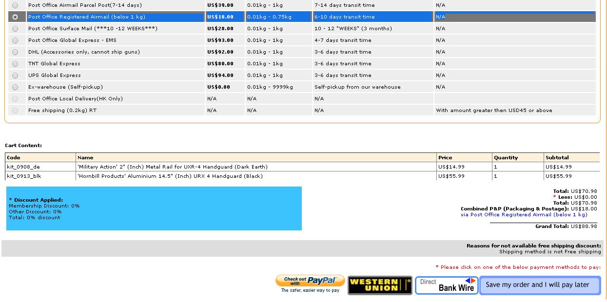 Zdravim vas.. chcem sa spytat cital som tu temy o RSOV.com a vsetci mali len dobre ohlasy tak som si povedal ze ich tiez vyskusam. maju naozaj veci co sa u nas nedaju zohnat... Mam vybrate len mam trochu problem pri vybere dopravy.... Ak mi pise ze ma balik cca 0,55kg a chcem lacne postovne mam si vybrat to druhe? Znamena to ze do 1kg mi to prijde letecky za cca 6-10dni??? Resp aku dopravu odporucate a pouzivate vy.... Dakujem....Dole prikladam fotku aby sme sa pochopili