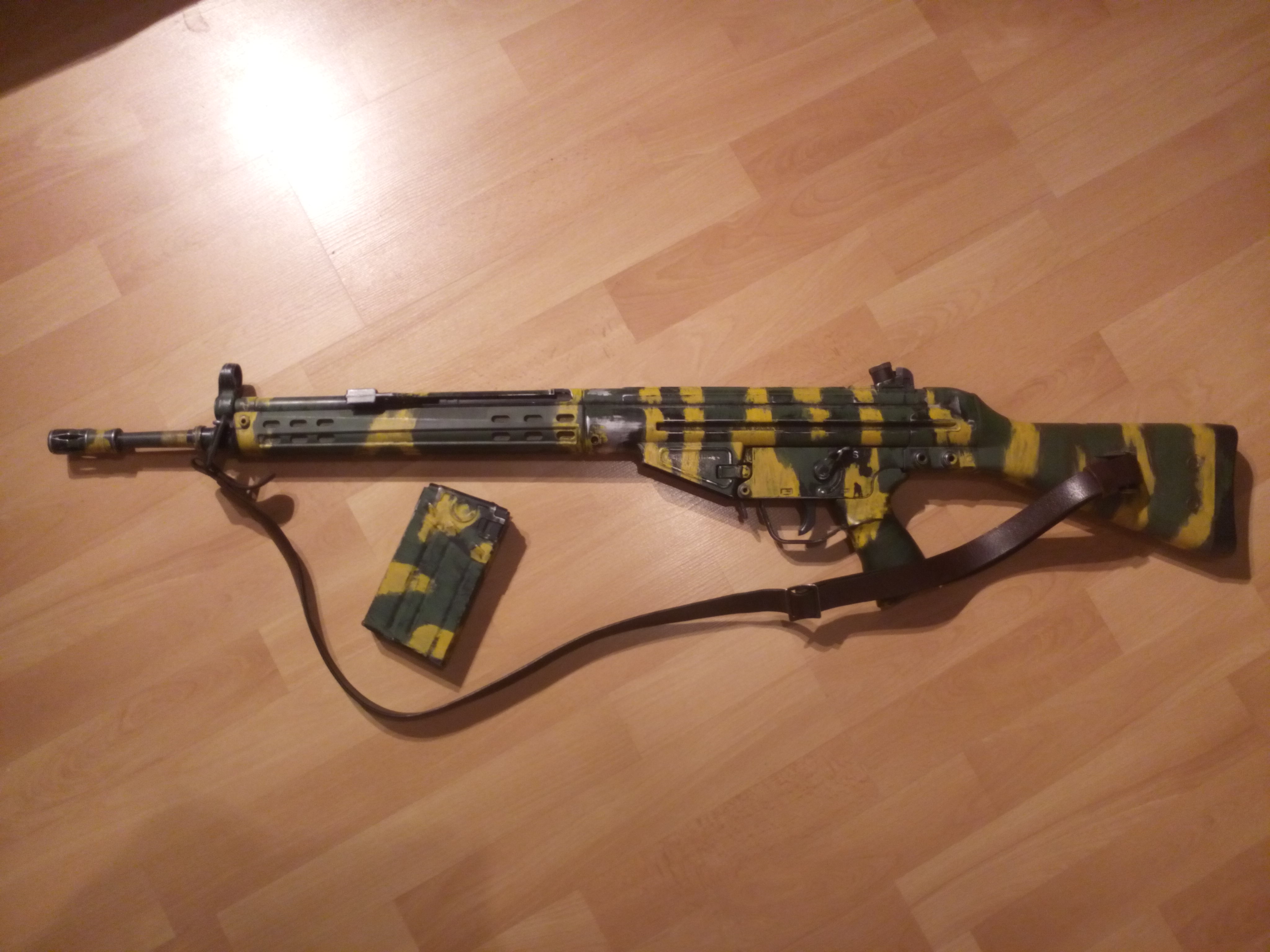Uvažuju nad prodejem svého miláčka - G3 od Classic Army. Zbraň byla původně ta "sniper" varianta, ale dneska už je tam zelené předpažbí a pažba typu A3 (fy. CA). Vevnitř: 120tka pružina (čína) nová kluzná ložiska (SHS) píst (SHS) hlava pístu a hlava válce (Guru) tryska (Guru) Motor superzátěžový (element) Hop-up guma (Guarder) přesná hlaveň (Guarder) Nová kabeláž včetně mos-fetu ukončená dean-T konektorem Zbraň má jediné dvě vady: naprasklá pažbička, je slepená a nijak se to nezvětšuje, původní zásobník má ulomený přední záchyt, ale ve zbrani spolehlivě drží a vlastně to na jeho funkčnosti není vůbec poznat. Zbraň má momentálně nátěr, kterým se tyto pušky standartně opatřovali při válce v Rhodesii a jsem schopen ho na základě zájmu odstranit. Ke zbrani přikládám ještě původní černou pažbu s gumovou patkou a originální kožený popruh.