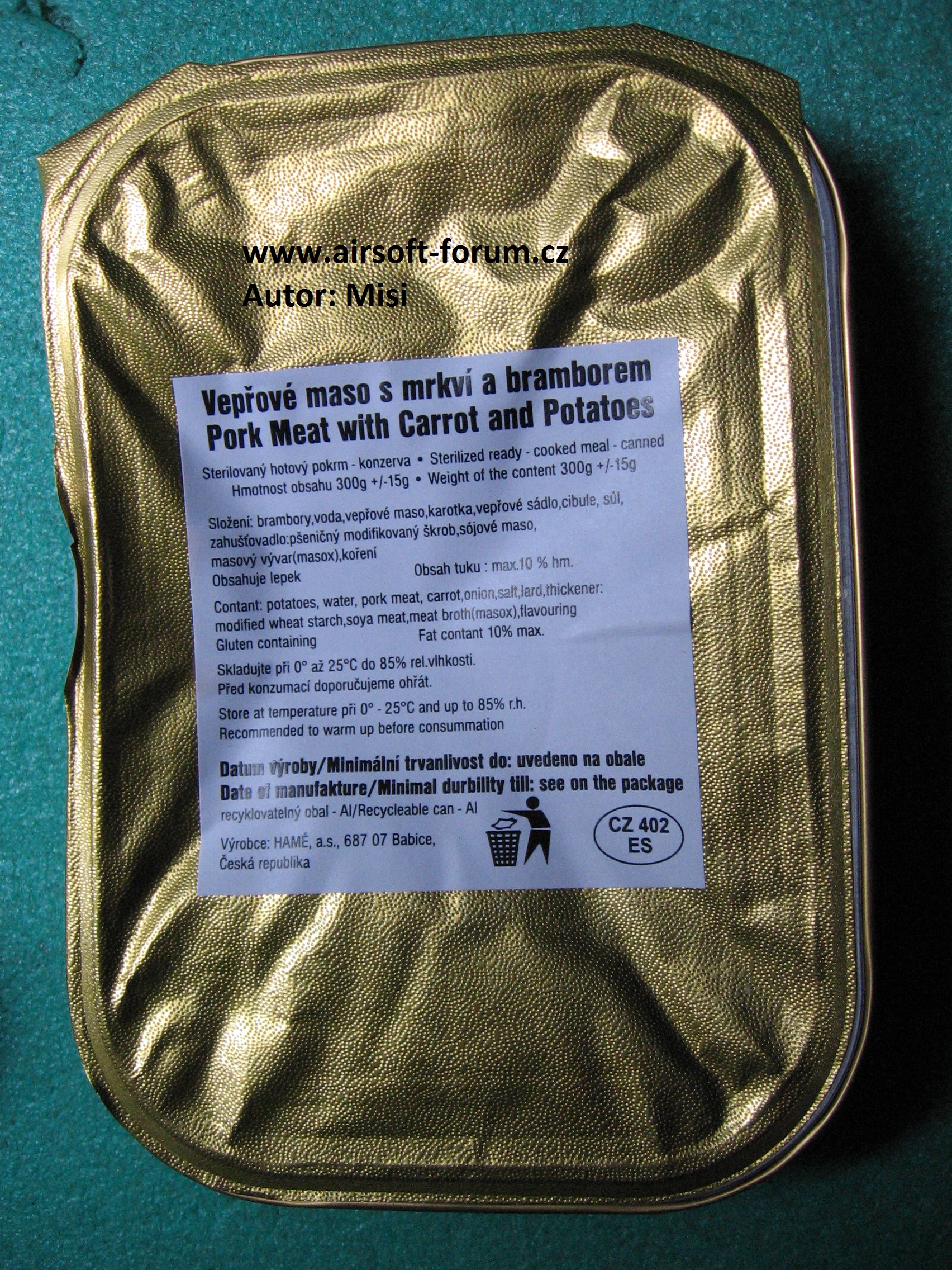 Deacon píše: Mám doma BDP IV,V a VI. BDP IV by měla být rajská, VI slepice na smetaně, ale nemůžu najít co je v BDP V. Neví někdo? Google mlčí  EDIT: zjištěno, v pětce je vepřový guláš  Bojová dávka potravin.