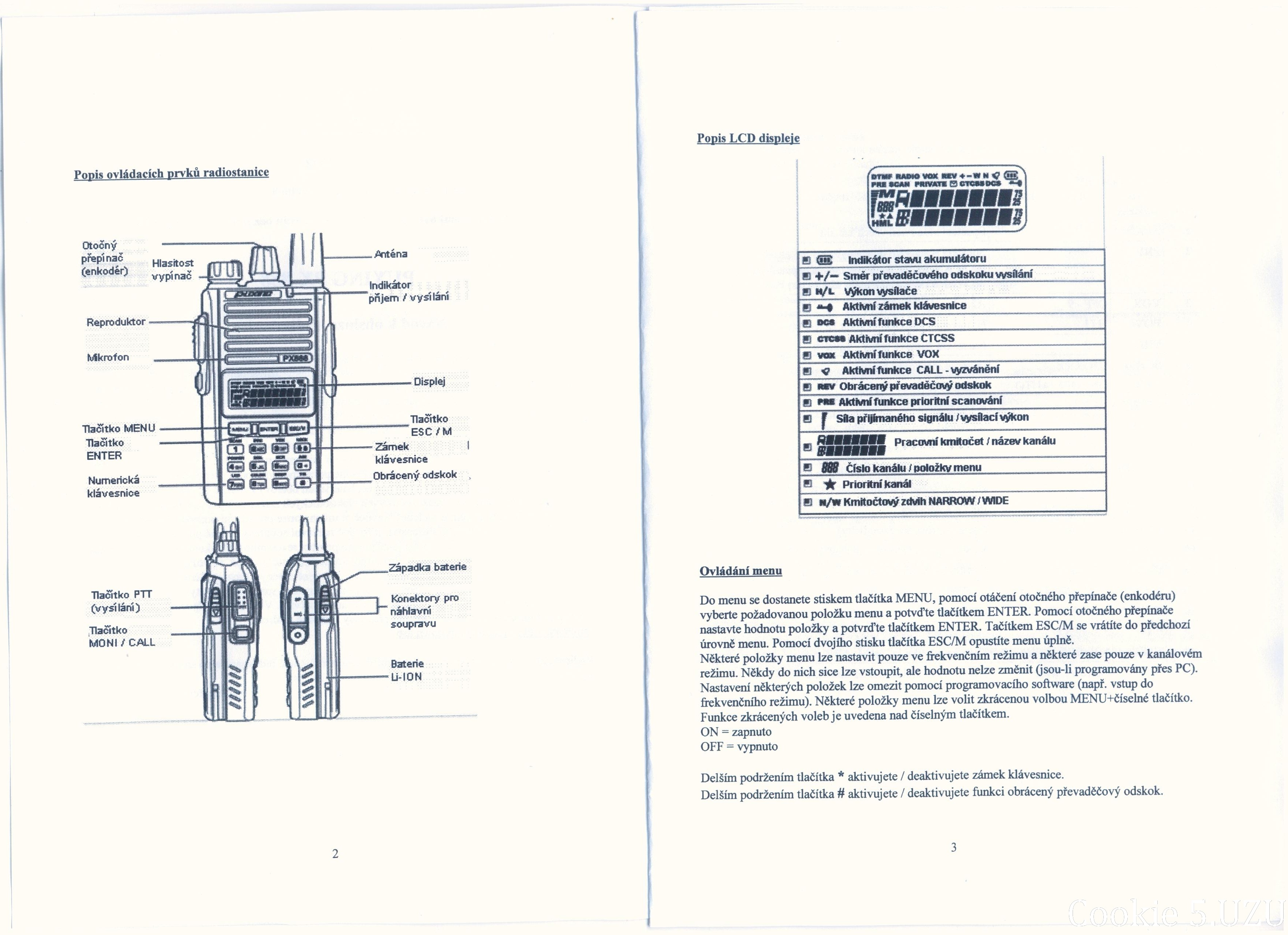 Uživatel Cookie nám prokázal velikou laskavost a poskytl scany českého návodu k velmi oblíbené radiostanici Puxing PX-888. Jsou k dispozici v příloze tohoto příspěvku. Kopírování bez svolení je přísně zakázáno! Já osobně NEJSEM MAJITELEM TÉTO RADIOSTANICE a tudíž mne prosím nekontaktujte s prosbami o pomoc, radu, další materiály a podobně, NEMÁM JAK VÁM POMOCI.