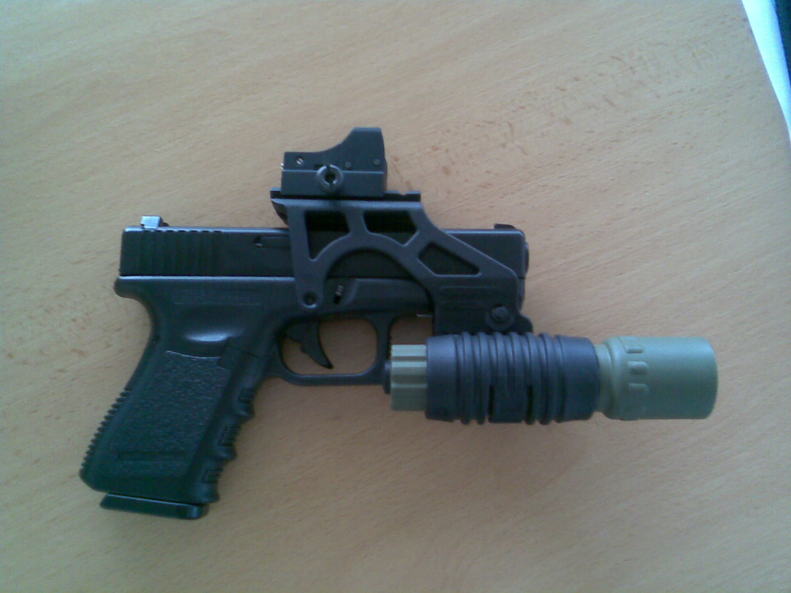 PÁNOVÉ ČUČTE !!! To co vidíte je můj plynový Glock asi 19 od KJW a doplňky z ostrého Glocka mého kolegy. Vše kupodivu přesně pasovalo. Kdyby to nestálo takový ranec, tak by to bylo dobré na CQB Co tomu říkáte???