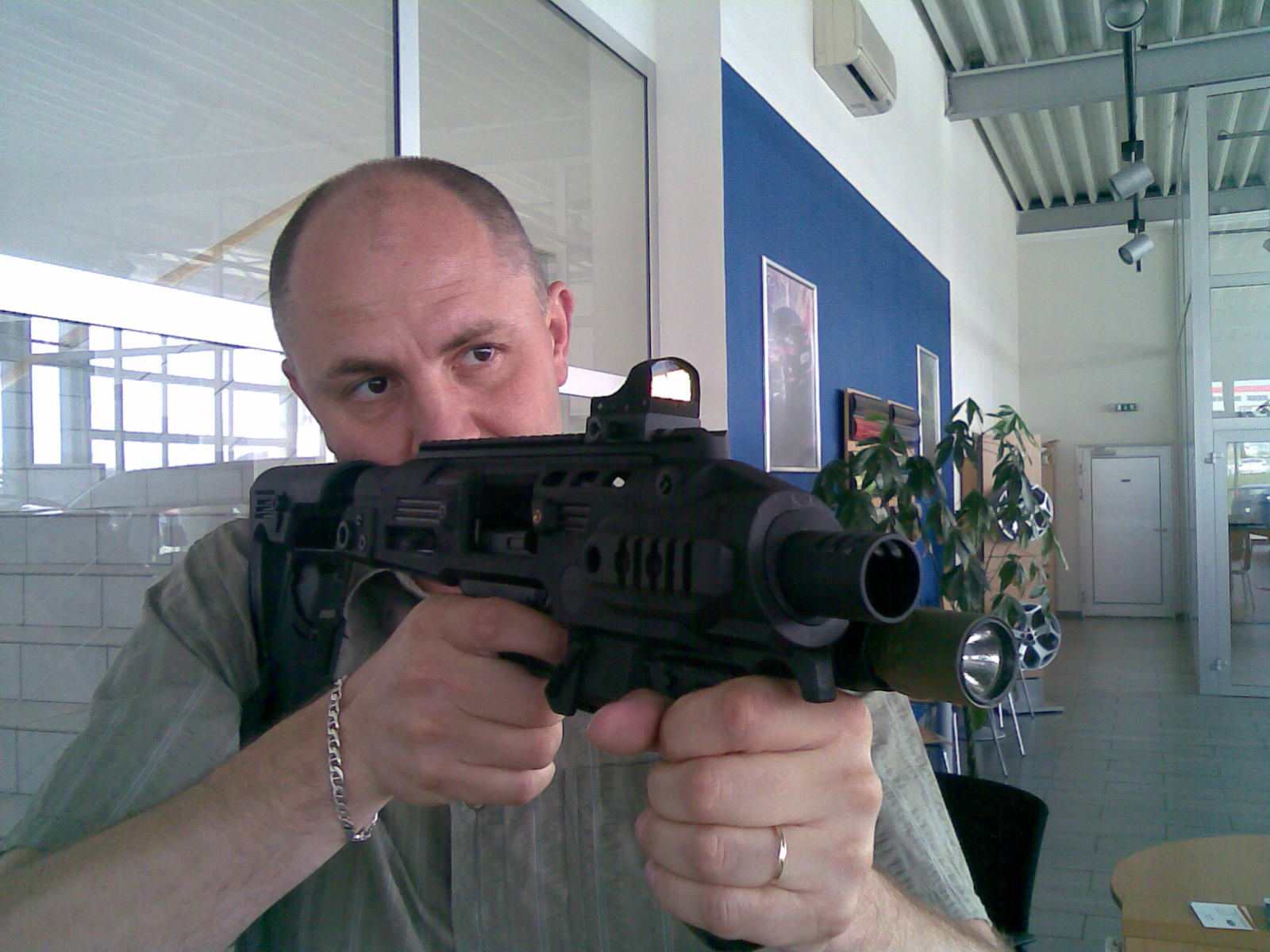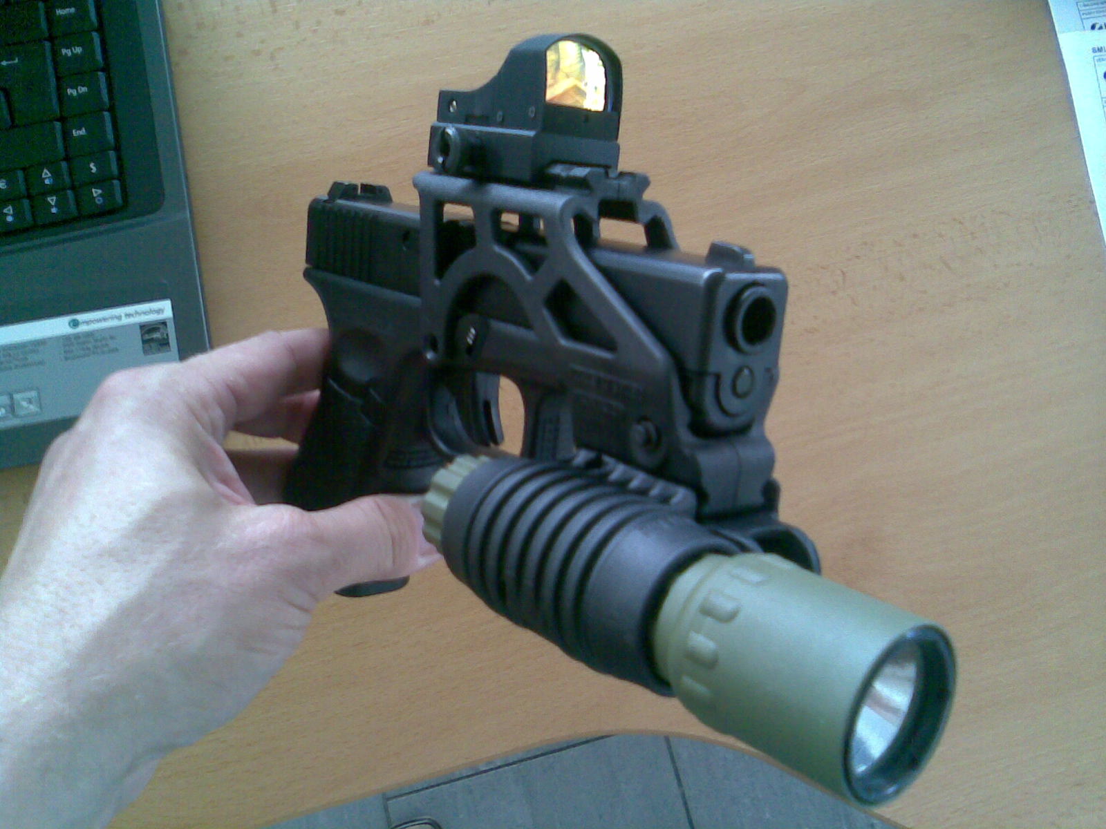 YENKEE píše: PÁNOVÉ ČUČTE !!! To co vidíte je můj plynový Glock asi 19 od KJW a doplňky z ostrého Glocka mého kolegy. Vše kupodivu přesně pasovalo. Kdyby to nestálo takový ranec, tak by to bylo dobré na CQB Co tomu říkáte??? Já mám karabiny tohoto typu rád, ale vyrábět je z pistolí mi přijde nepraktické, protože je to pořád pistole. MP7 je lepší. Ale vypadá to dobře, to musím uznat.