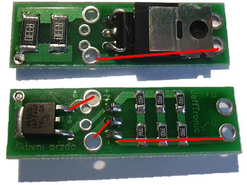 koukam, ze je na fotce brzda I. generace, tu jsem prestal nabizet ve variante bez kabelaze pred vice jak 1 rokem. V eshopu u ni bylo navic napsano, ze se nesmi pouzivat lipol baterie (proc asi  ). Zajimalo by me, s jakou baterii, pruzinou, kolach a motoru mas tuto brzdu provozovanou. Doprodavam jeste tyto brzdy pouze s univerzalni kabelazi, kde jsou tyto cesty posilene o dratove propojky, ale i tak zakazuji pouzivani 11.1V lipolek. Proto je i u tebe nejlepsi moznost pripajet na konce cest propojky z dratu 0,75qmm - 1,5qmm. Tj. cervene cery viz muj obrazek. Prave z duvodu nedostateneho dimenzovani cest pro lipol baterie jsem udelal pred rokem novou variantu zarizeni, ktere maji cesty min. 2x vetsi a tlustsi a tam neni jiz zadny problem.