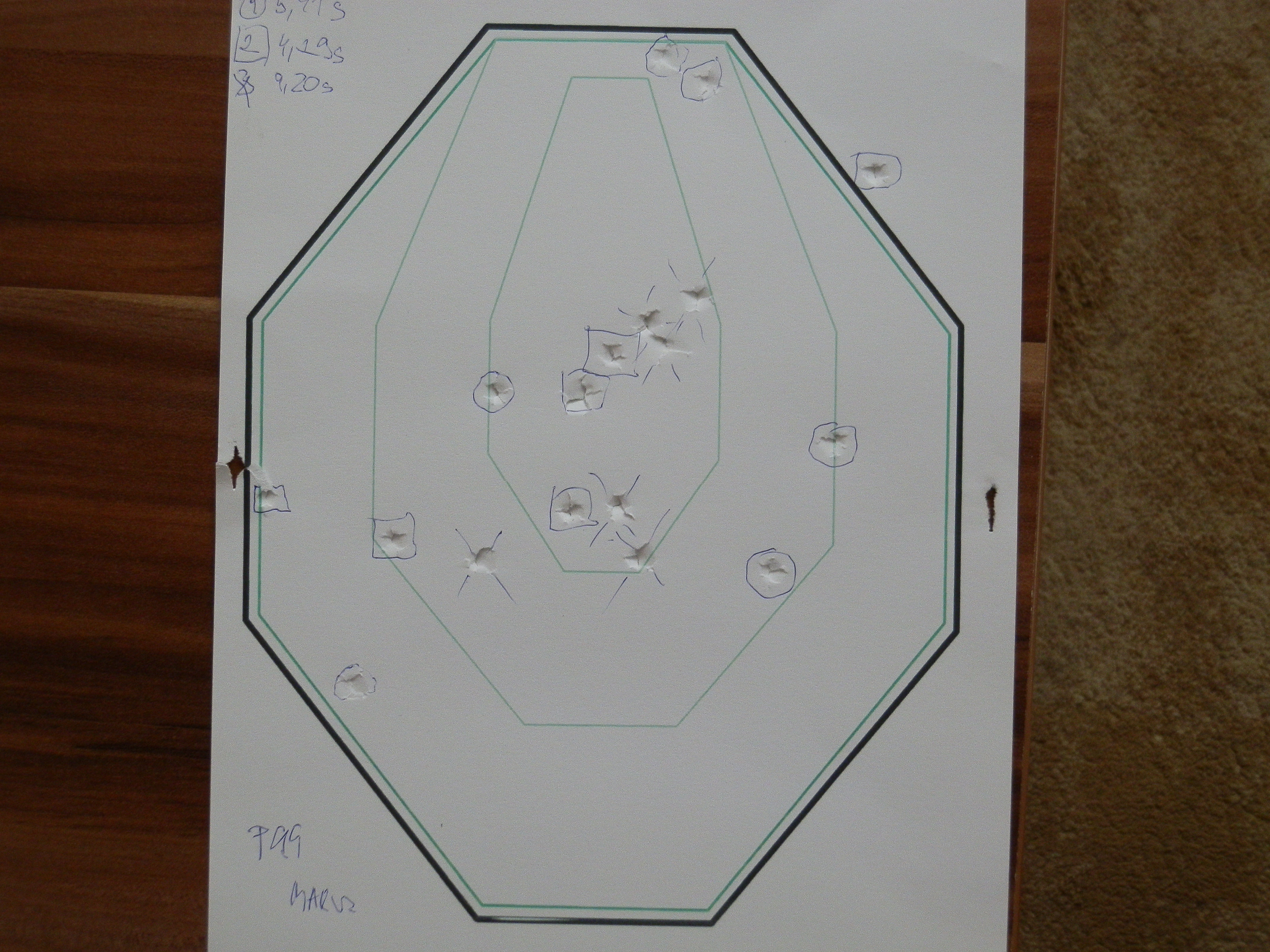Ešte by som pridal nejaké výsledky zo streľby Terč formát A4 veľkosť ALFY 60 x 128 mm 3 série 6 striel 5m P99 AS Marusen 1. séria: 1xA + 4xC + 1xD=18 čas 5,91 s Hit 3,04 2. séria: 3xA + 1xC + 1xD + 1xM = 9 čas 4,29 s Hit 2,09 3. séria: 5xA + 1xC = 26 čas 9,2 s Hit 2,82