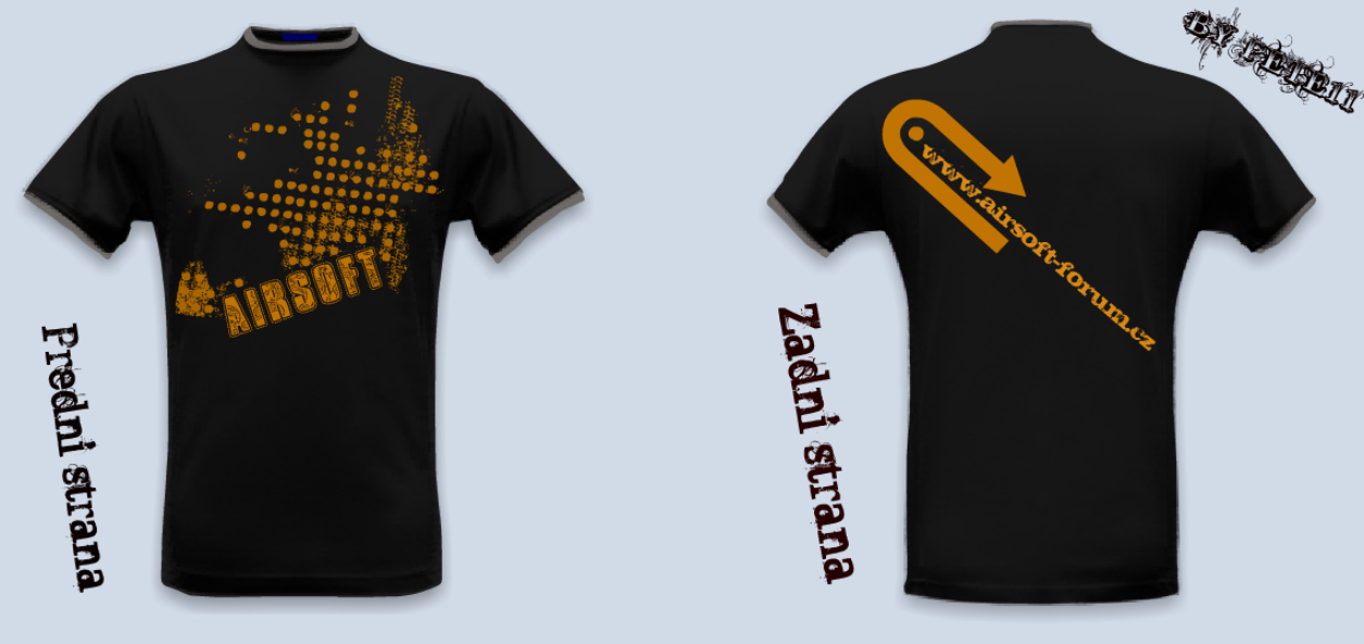 Děkuji všem za komenty... avšak bych chtěl poprosit o opravu mého jména na čistě jen pete-11, nikoliv pete-011. K soutěži: Někdo tu načal že by mělo být triko prezentativní k airsoftu jež by se dalo na první pohled poznat oč jde. Já si však stojím za názorem že tahle soutěž je o prezentaci tohoto fora a v dnešní době kdy zná airsoft i moje babička, tedy 70% populace české republiky, jistě pozná každý oč jde jen podle názvu. K návrhu: Jak už zde zaznělo mělo by to prezentovat tohle forum.. Takže jak vidíte snažil jsem se také držet charakteristických barev tohoto fora (oranžová,šedá,černá). Když se řekne slovo prezentativní, má to být něco co zaujme i obyčejného člověka. Je mi jasné že vám se líbí takové ty military témata (viz obrázek s člověkem s puškou), to mě taky ale člověk co se o to nezajímá to snadno přehlídne navíc takovích triček se nechá koupit hafo i na asmoravě. Popřemíšlel jsem nad tím a dospěl k názoru že to bude chtít něco moderního, originálního a hlavně snadno realizovatelného co se nechá nosit prakticky všude (aď už do kina nebo do školy)a co dokáže zaujmout. Když už jsem u toho zaujímání, obhájil bych rád i tu hnusnou šipku,,  je tam z jediného významu: zvírazní se tim adrasa tohoto fora. K samotnému navrhování: Abych se přiznal strávil jsem nad tím pár hodin aď už navrhováním nečeho lehkého co zaujme až po návrh střihu trika a barevných kombinací, takže v malování jsem to opravdu nedělal. Ps: skate styl taky nesnášim, tudíž bych to do tohohle stylu neřadil..