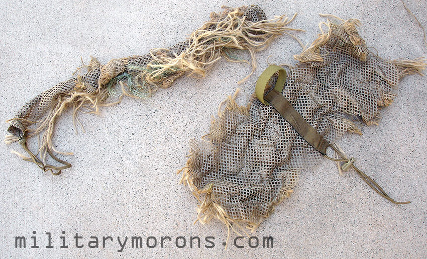 Na maskování zbraně je nejlepší sniper mesh - síťovina vychytaná tak, že nikde nepřekáží (jako barakuda, nedejbože shemag na zbrani), dá se kolem hlavně a puškohledu stahovat, je na tom našitá padákovka pro uchycení juty...