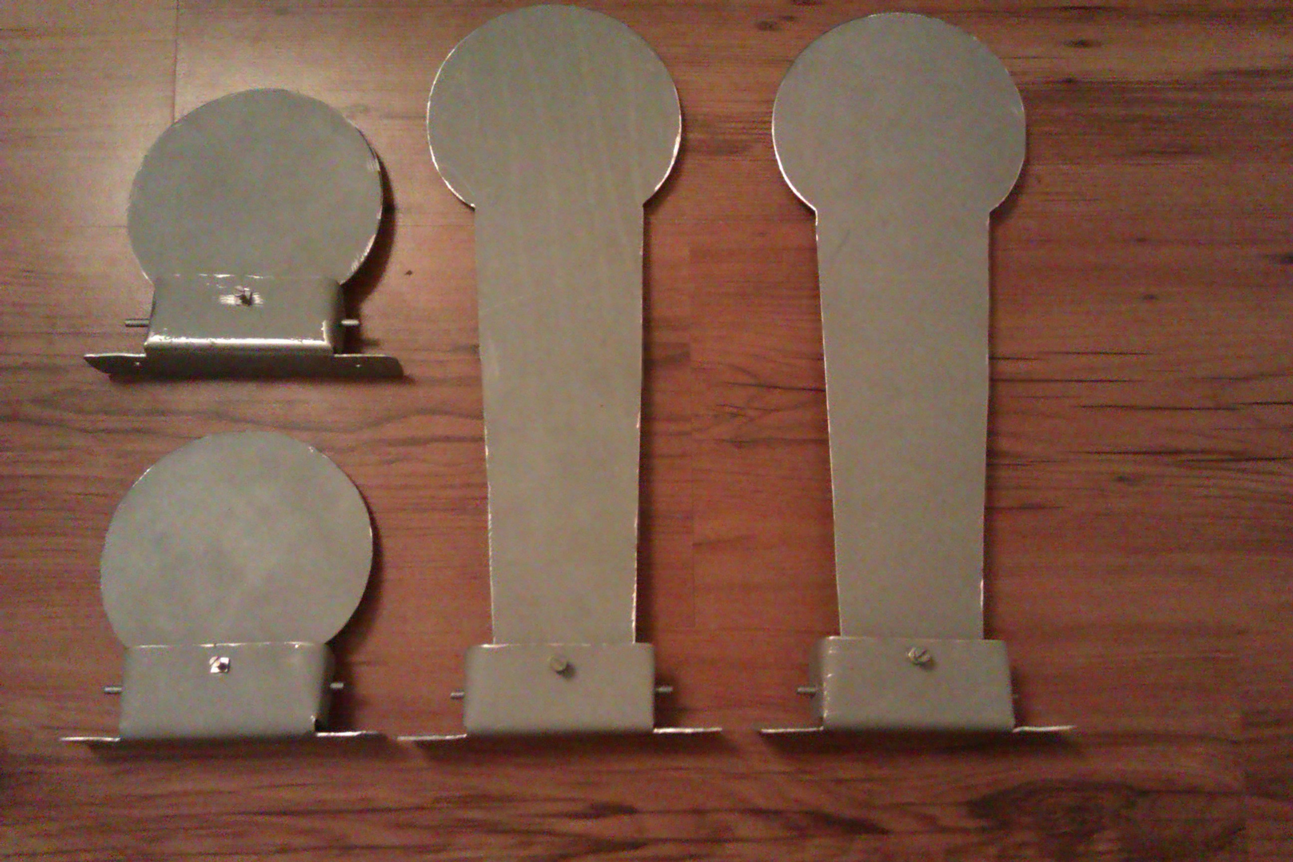 Chcel som kúpiť minipoppers na airsoft IPSC, ale tie ceny sú nehorázne. Najlacnejšie mi núkali po 20 EUR za kus. Tak som si to vyrobil vo vlastnej réžii (keby mal niekto záujem nech sa mi ozve). Poppers sú z pozinkovaného oceľového plechu hrúbky 1,2 mm, podstava má hrúbku 5 mm.