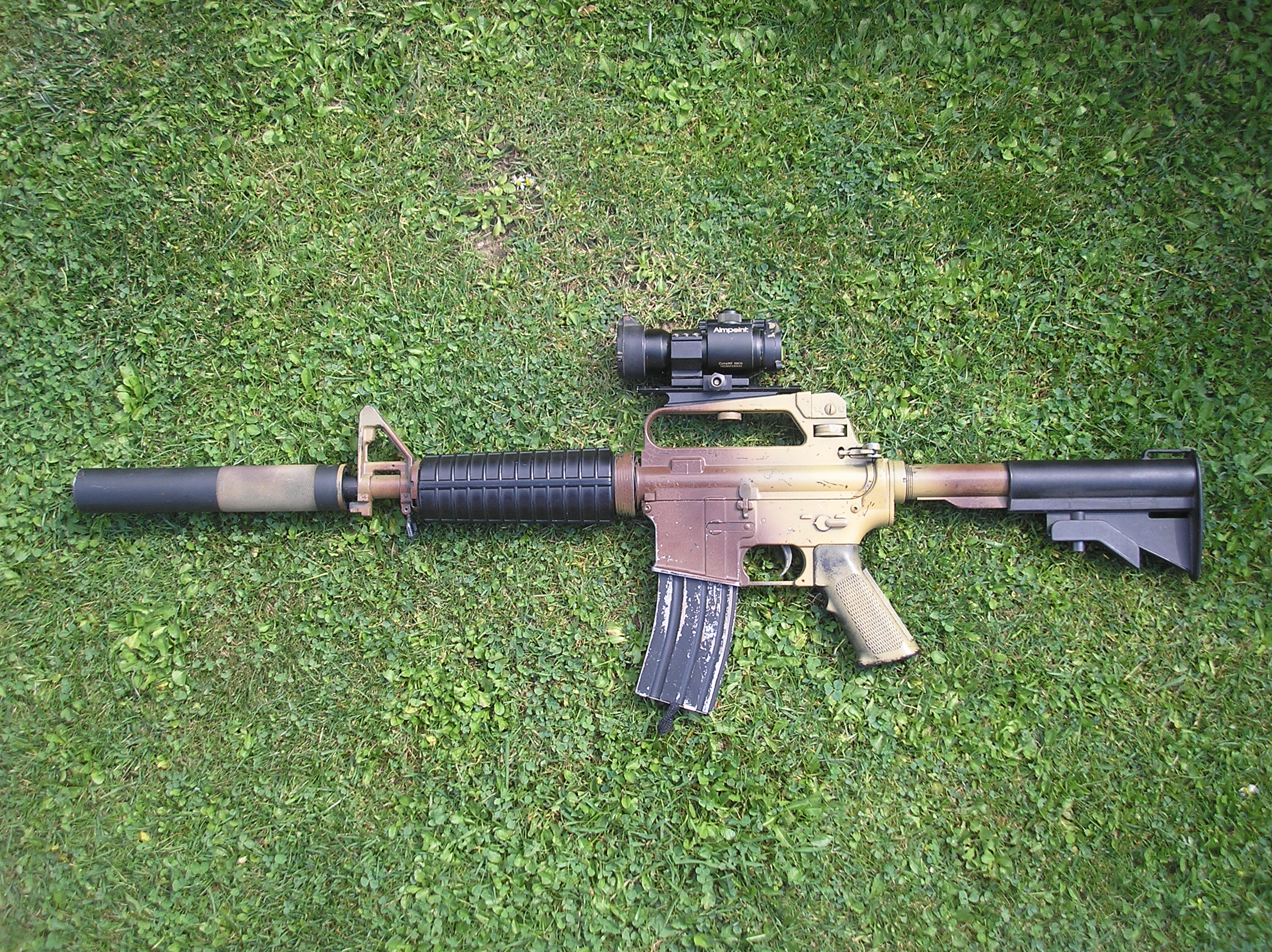 Moje nová kráska, sice měla být pro přítelkyni, ale zabavila mi SUčko a tohle zbylo na mě. Tlumič je takový provizorní, vyrobený doma - v budoucnu bude pískový. Místo téhle šeredné optiky příde ACOG nebo možná Elcan Specter, ale dvojku kvůli kosmetickému detailu se mi v současnosti fakt dávat nechce... Naopak SCAR dvojnožka/grip je fakt úžasně praktická.