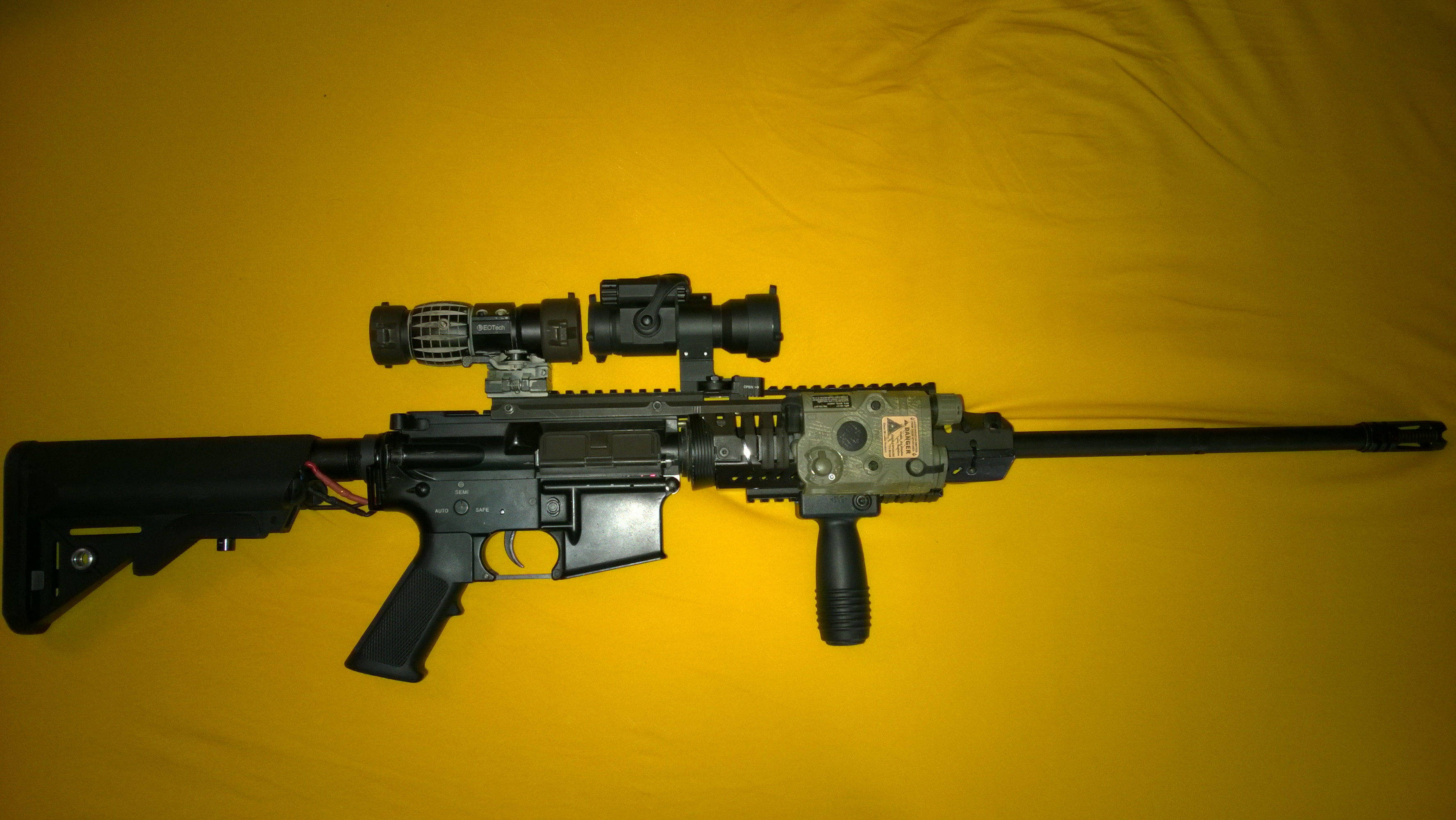 Tady posílám své DMR. Původně to je Armalite M15A4 SPR od CA. Výkon je cca 140 m/s s 0,36g BB. Tlumičem prochází hlaveň PDI 650mm/6,01mm. Mód střelby mám nastavený semi=jeden výstřel, auto=3 ranný burst. Budu měnit předpažbí za rifle Magpull MOE a doufat že tam dám Lipolku  rád bych se totiž zbavil AN/PEQ 2 a taky tam chci jinou montáž na bipod.