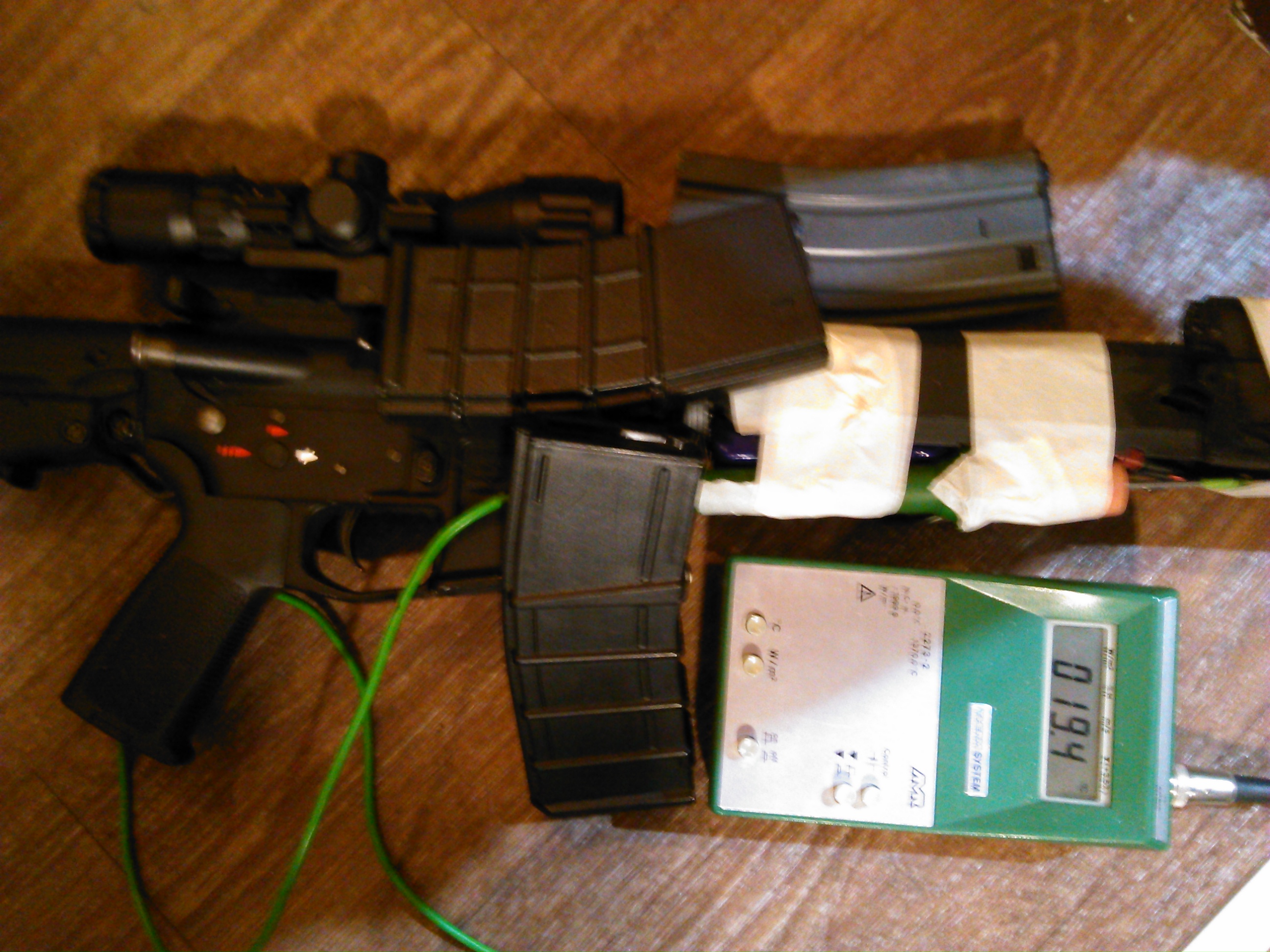Také jsem dostal Jeffův mikromosfet na testování a zde jsou mé postřehy: Pájení bylo naprosto bez problémů, použil jsem silikonové kabely 1,5mm. Myslím, že schéma zapojení je naproto jasné pro každého kdo má alespoň základní zkušenosti s upgradem. Sám jsem zapojení upravil tak abych ho mohl přes konektory připojit i na zbraň která má 4 vodičový vývod na Jeffovu procesorovku. Mosfet jsem nezkoušel nikam instalovat jelikož jsem měřil jeho teplotu při testování, ale je opravdu malý a myslím si že se nenajde zbraň kde by se na něj místo nevymyslelo. Mosfet jsem testoval na dvou zbraních a to MP5 SRC a costum AR-15. Při testování jsem použil 7,4V 30-40C 2200mah Truningy lipo a 11,1V 40-80C 1400mah Turningy nano tech lipo. MP5 SRC: Motor původní SRC magnetar (neodynyové magnety), pružina GD 110, píst kola vše původní, nově promazána přopodložkována. Vytřílel jsem ze zbraně 3klasické točné zásobníky do MP5 a to středními dávkami ihned po sobě (rozestup mezi dávkami minimální pouze na puštění zpouště popřípadě přemíření) a sériemi jednotlivých ran hned po sobě. Mezi zásobníky byl čas pouze na doplnění a natočení točáku. 1. zásobník 22-30,5°C 7,4V 2. zásobník 25-32°C 7,4V 3. Zásobník 25-33°C 11,1V Jak je vydět tak mosfet zvládal bez problémů a i za čas přebytí zásobníku stačil vychladnout. AR-15 Motor Systema magnum, SRC zátěžové šikmáče, GD M140, dobře vypodložkována a promazána. Ze zbraně jsem vystřílel 2 a půl standartních točáků do M16, Opět postup střelby stejný jako u minulé zbraně, ale zde byli zásobníky vyměňovány okamžitě - čas nutný pouze na výměnu zásobníků ve zbrani. 1. 19,2-48°C 11,1V 2. 44,7-60°C 11,1V 3. 59-81°C 11,1V