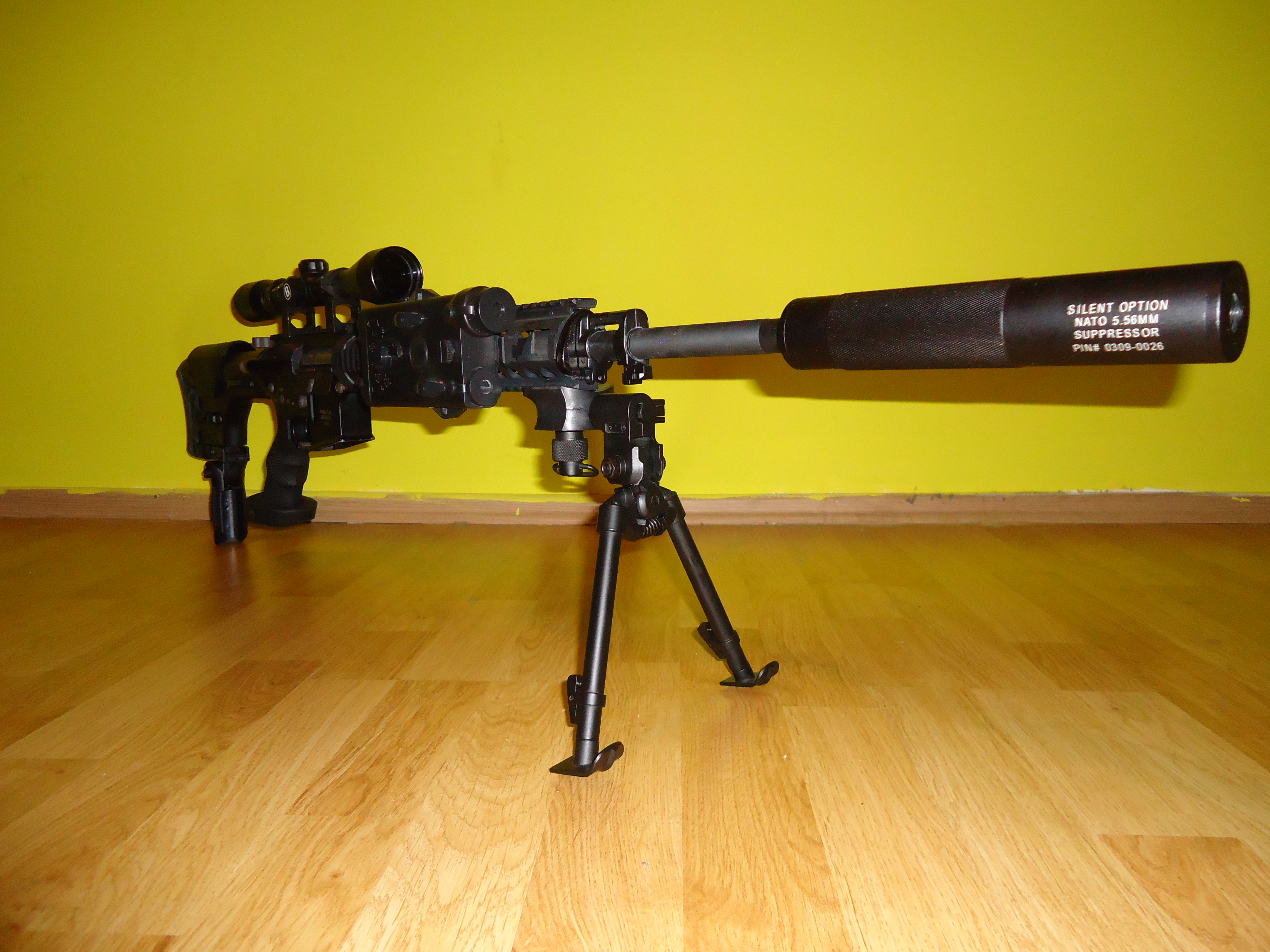 Tady posílám své DMR. Původně to je Armalite M15A4 SPR od CA. Výkon je cca 140 m/s s 0,36g BB. Tlumičem prochází hlaveň PDI 650mm/6,01mm. Mód střelby mám nastavený semi=jeden výstřel, auto=3 ranný burst. Budu měnit předpažbí za rifle Magpull MOE a doufat že tam dám Lipolku  rád bych se totiž zbavil AN/PEQ 2 a taky tam chci jinou montáž na bipod.