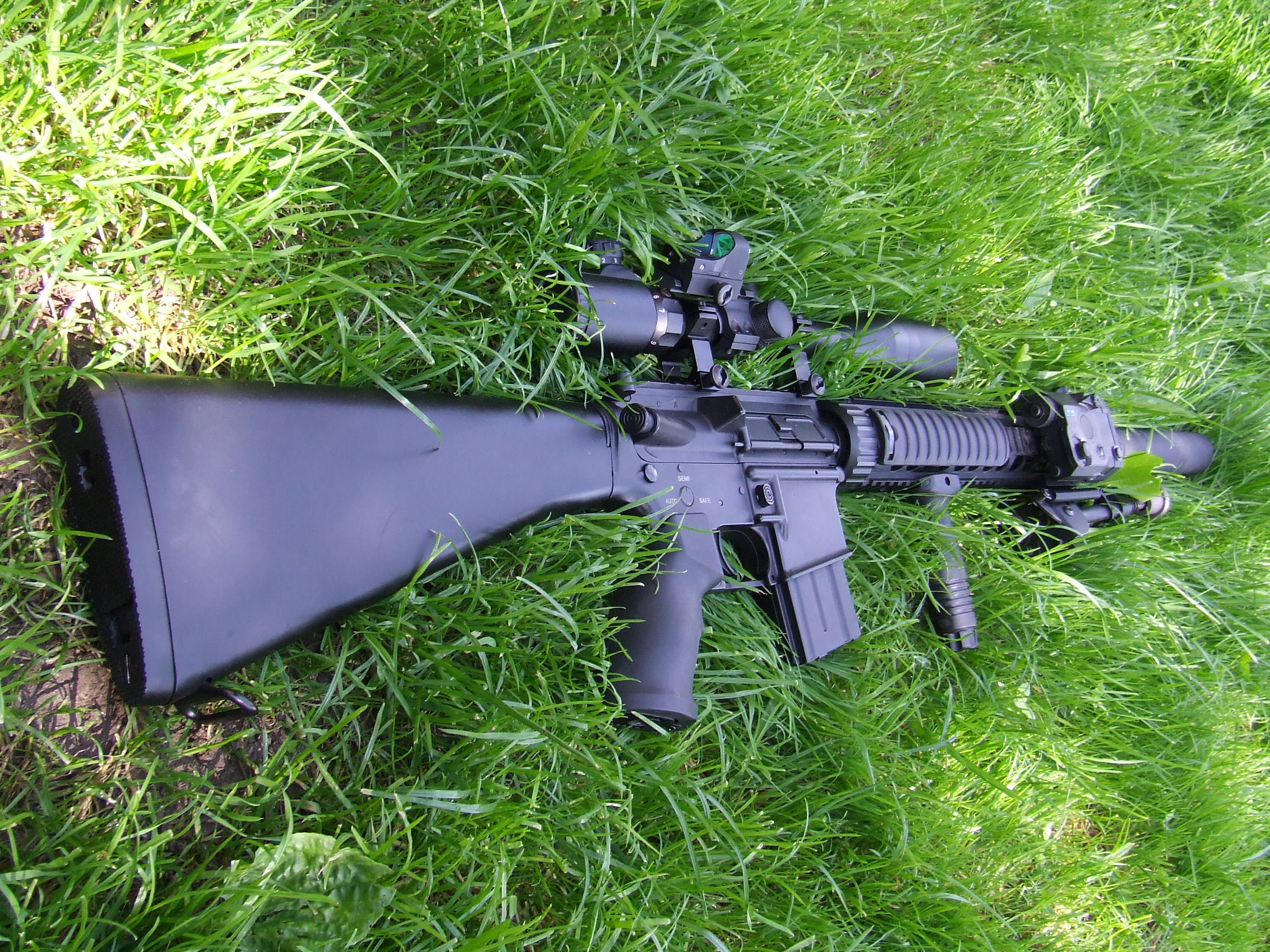 Tady posílám své DMR. Původně to je Armalite M15A4 SPR od CA. Výkon je cca 140 m/s s 0,36g BB. Tlumičem prochází hlaveň PDI 650mm/6,01mm. Mód střelby mám nastavený semi=jeden výstřel, auto=3 ranný burst. Budu měnit předpažbí za rifle Magpull MOE a doufat že tam dám Lipolku  rád bych se totiž zbavil AN/PEQ 2 a taky tam chci jinou montáž na bipod.