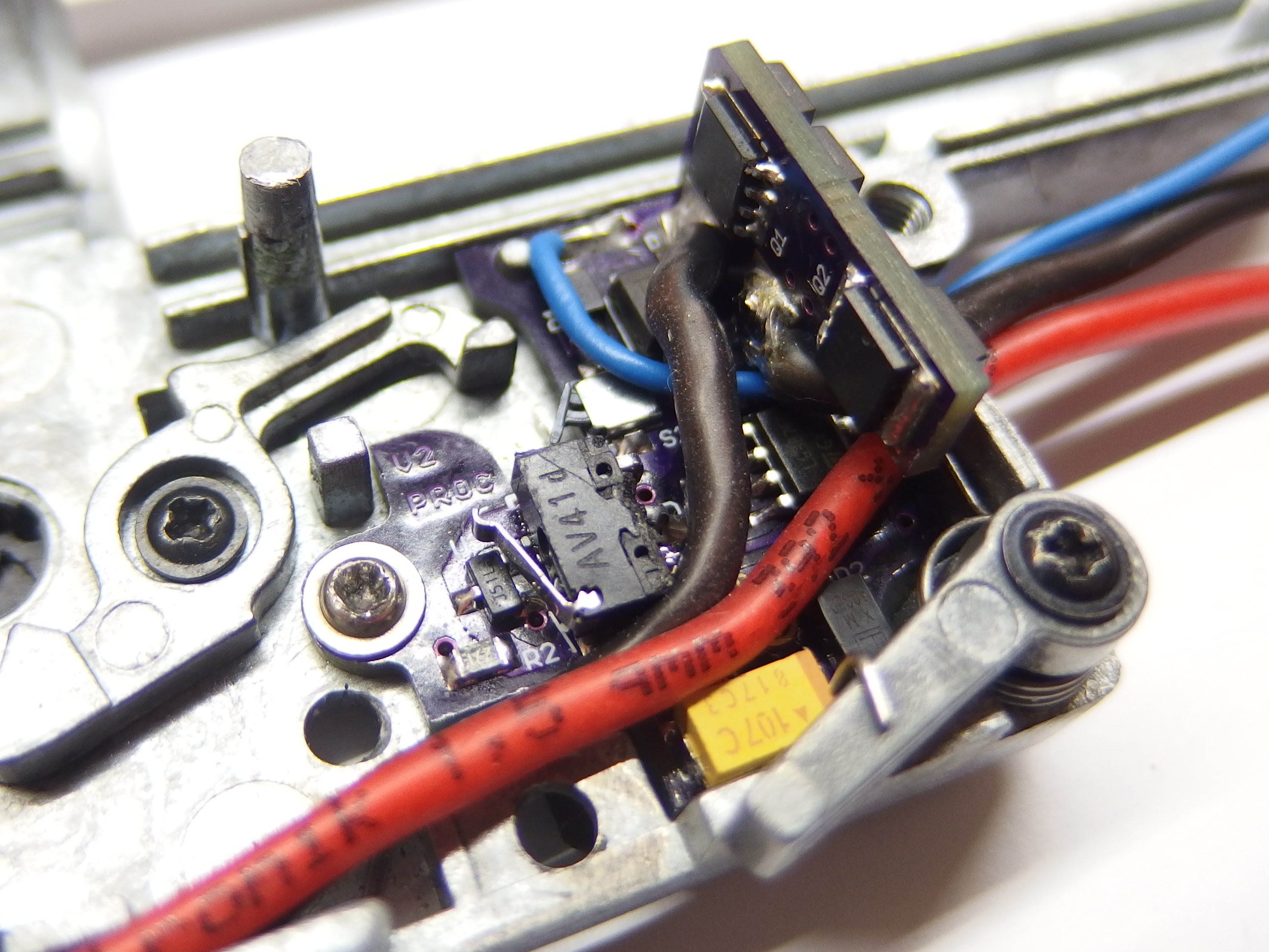 Zdá se mi, že mikrospínač je docela hodně posazený nízko. Tedy chtělo by ho to spíše osadit tak o 1mm až 1,5mm výše na desce. - Já osobně s tím mám velký problém u ASG mechaboxu s SHS přerušovačem - už jsme ho spiloval opravdu hodně a stále střílí na semi auto...