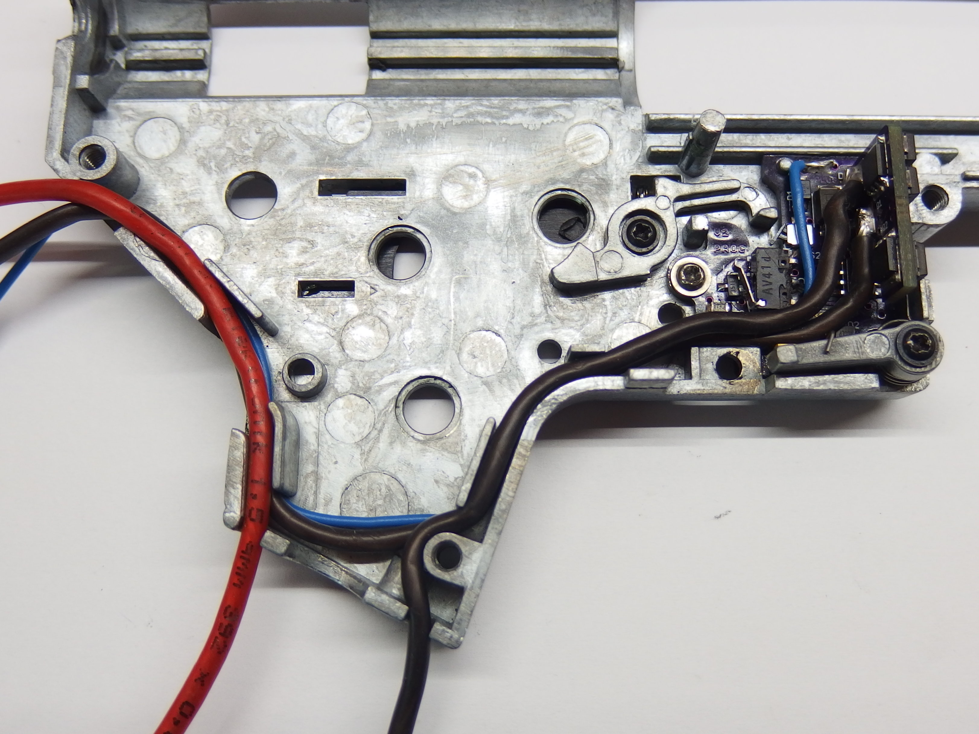 Zdá se mi, že mikrospínač je docela hodně posazený nízko. Tedy chtělo by ho to spíše osadit tak o 1mm až 1,5mm výše na desce. - Já osobně s tím mám velký problém u ASG mechaboxu s SHS přerušovačem - už jsme ho spiloval opravdu hodně a stále střílí na semi auto...