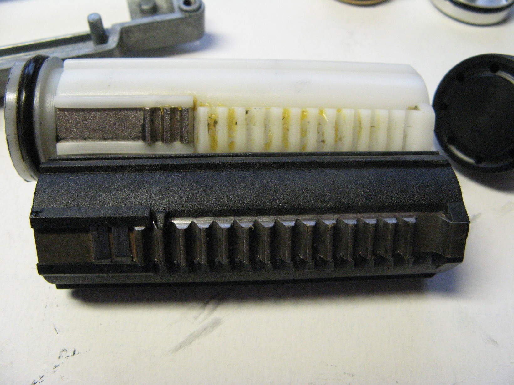Nazdar! Tak jsem se rozhodl upradovat svoji M16A4 od GP na pružinu M120. Hlavní část upgradu tvořilo toto: http://www.guruupgrade.com/sety-valce-n ... nikl-profi . Dále jsem přidal mosfet a hop-up gumičku a pružinu od guarder. Když mi tento set přišel, měl jsem rozporuplné pocity. Píst měl 14 kovových zubů (na stránce psáno 16) dva evidentně zbroušené na konci. (přisuzuji to chybě stránek, jelikož na obrázcích měl taky 14 zubů). Válec my přišel jakýsi hrubý (myslím vnitřní povrch ne vroubkování svrchu na odvádění tepla) a lehce špinavý (nešlo vyčistit suchým papírovým kapesníčkem) což mně moc nepotěšilo. A tryska byla z vrchu čímsi zašpiněná. Dále dorazová guma na hlavě válce měla uprostřed jakýsi výron. Celkově jsem čekal lepší zpracování, jediné co má u mně 10 bodů je hlava pístu která je zpracovaná opravdu luxusně. Dnes jsem zbraň otevřel a koukají na mně další překvapení: píst GP má 15 zubů (tři kovové). Válec (plný, bez díry) s hladším vnitřním povrchem než ten od guru. Takže se ptám: je ten válec v pořádku? Čím mám ten válec čistit? Nebude menší počet zubů na pístu dělat problémy? (asi ne díval jsem se na obrázky jiných pístu a počty jsou buď 15, nebo 14 zubů jen nemám praktické zkušenosti). Je ta tryska v pořádku? A copak GP má v základu NBU vzduchárnu nebo je to jen zvláštní válec bez díry?. Foto: